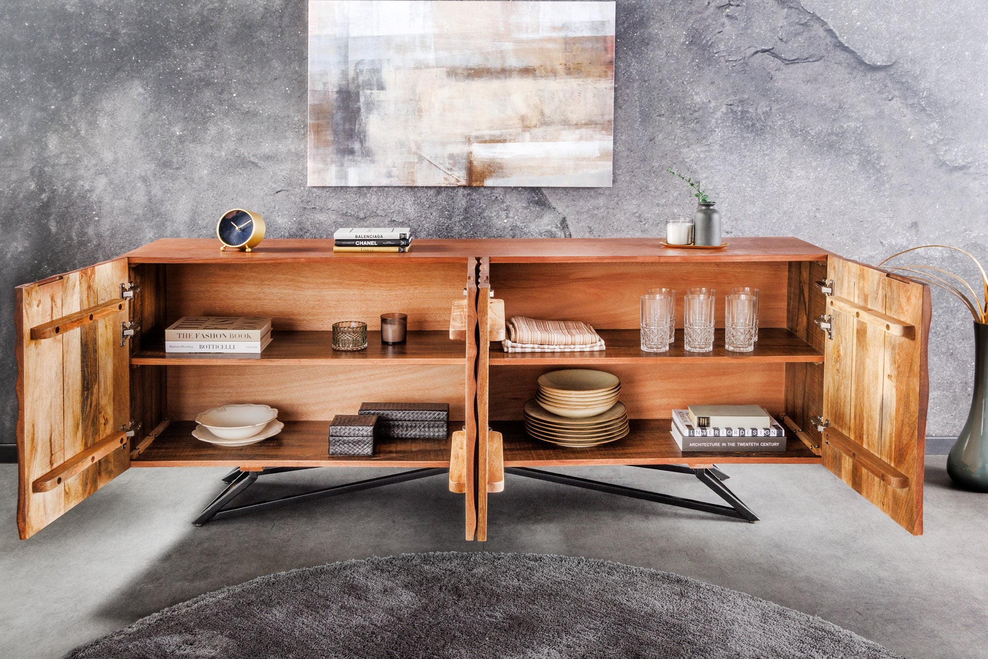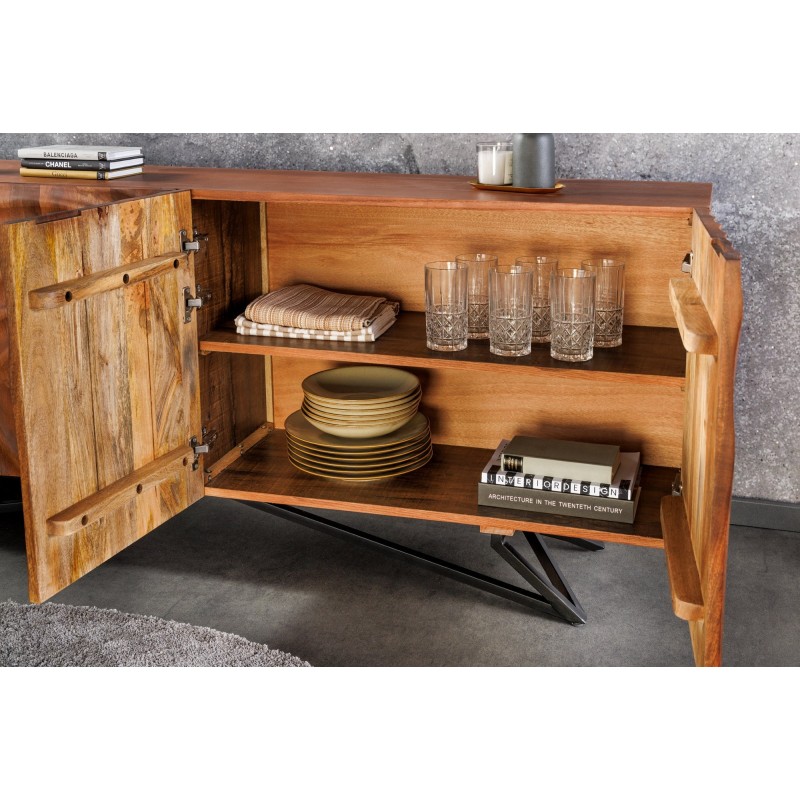 Ce buffet design se compose de 4 portes battantes ouvrant sur de vastes espaces de rangement dotés d’étagères intérieures, parfaits pour organiser vaisselle, linge de maison ou objets de décoration. Sa structure mêlant bois massif, MDF et métal assure robustesse et longévité.