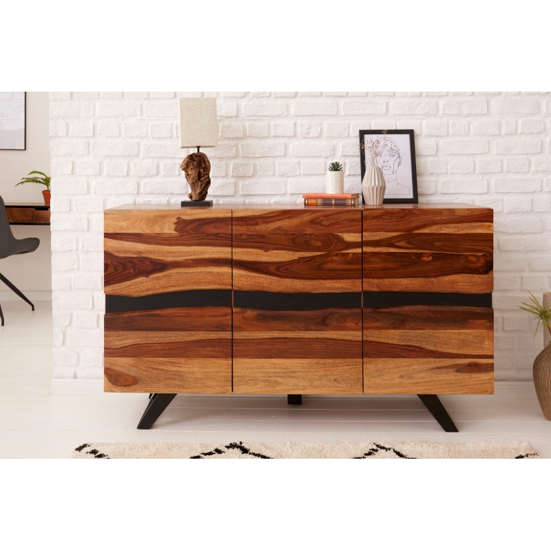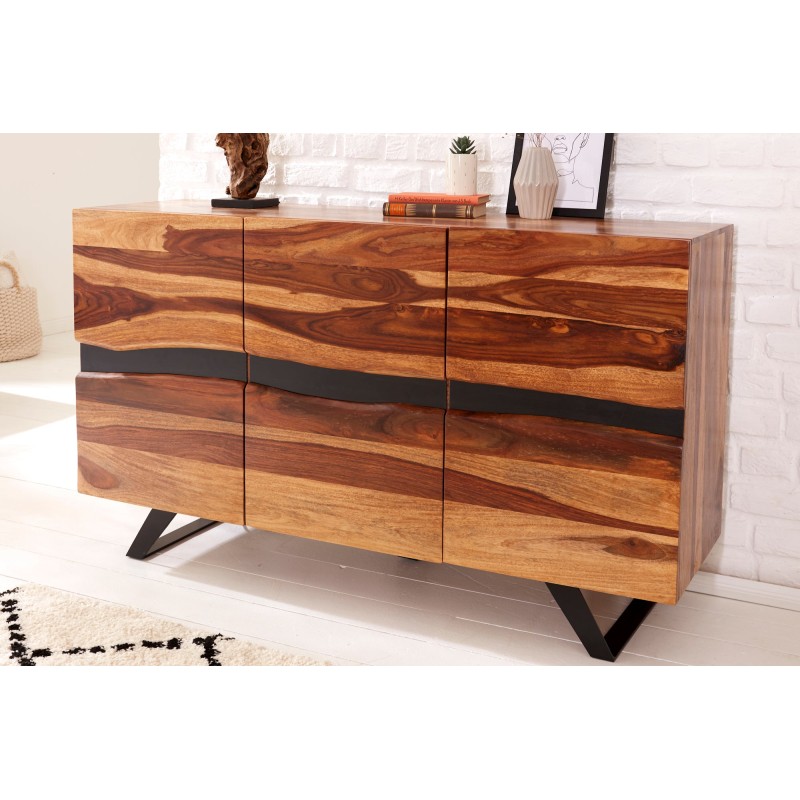 Alliant authenticité et modernité, le buffet SHEENA 150 cm se distingue par son bois massif de Sesham aux nuances naturelles spectaculaires. Ses lignes ondulées et ses pieds design en métal noir lui confèrent un style industriel à la fois brut et raffiné, idéal pour sublimer un intérieur contemporain ou loft.