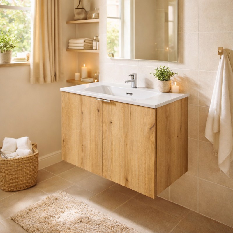 Aporta un toque elegante y funcional a tu baño con este juego VANO de 80 cm, que combina armónicamente los tonos roble oscuro y blanco.
