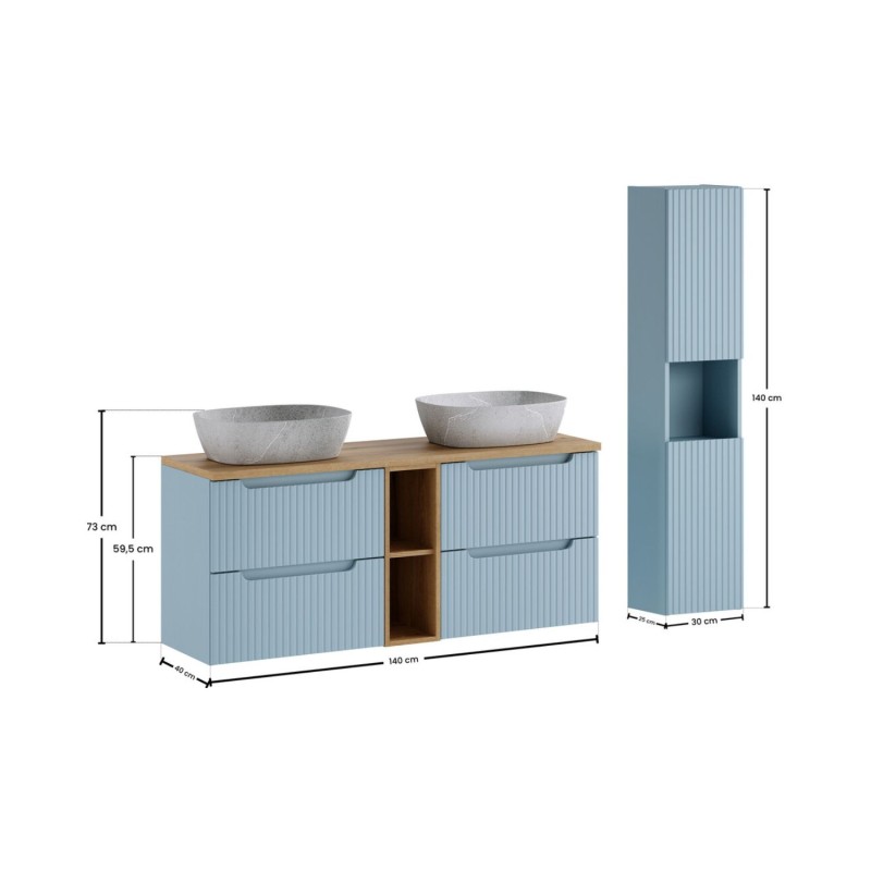 | dimensions_des_elements_(en_cm) | 2 meubles sous vasque 2 tiroirs : 60x57x39 + 1 meuble sous vasque central avec niches visibles : 20x57x38 + 1 plan pour vasque : 140,4x2,5x40 + 2 vasques à poser : 50,5x13,5x39,5 + 1 colonne : 30x140x25 |