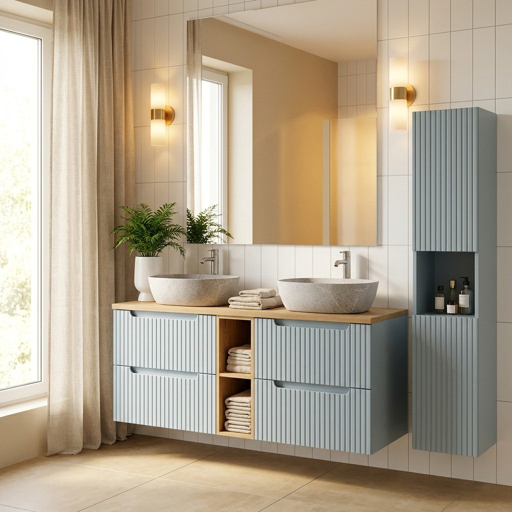 La encimera para lavamanos acoge dos lavamanos sobre encimera en cerámica gris mate, aportando un toque contemporáneo y refinado a tu baño.