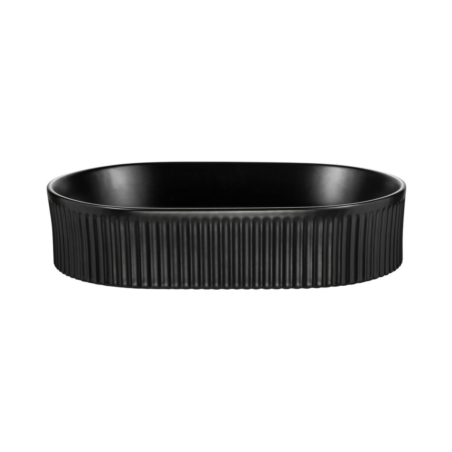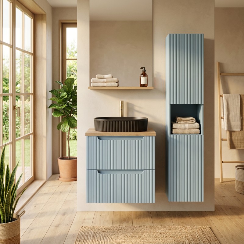 La encimera de aspecto roble claro alberga un lavabo sobre encimera de cerámica negra ranurada verticalmente, aportando un fuerte toque de diseño contemporáneo a su baño.
