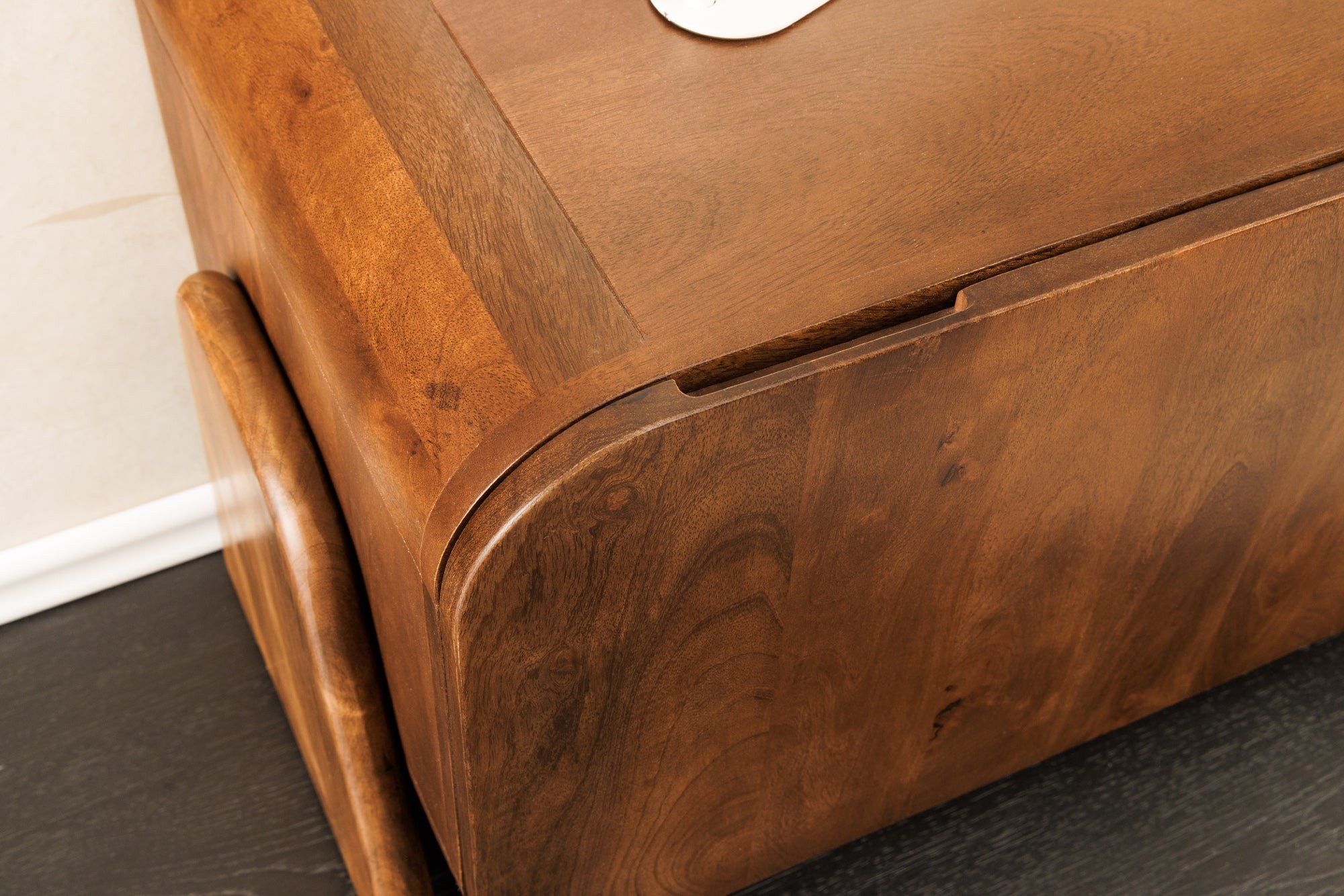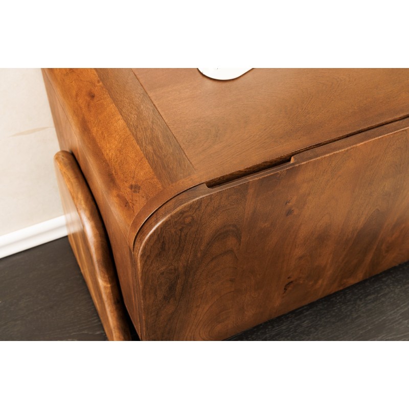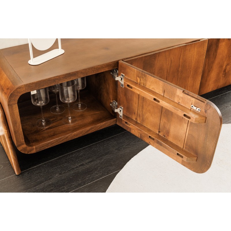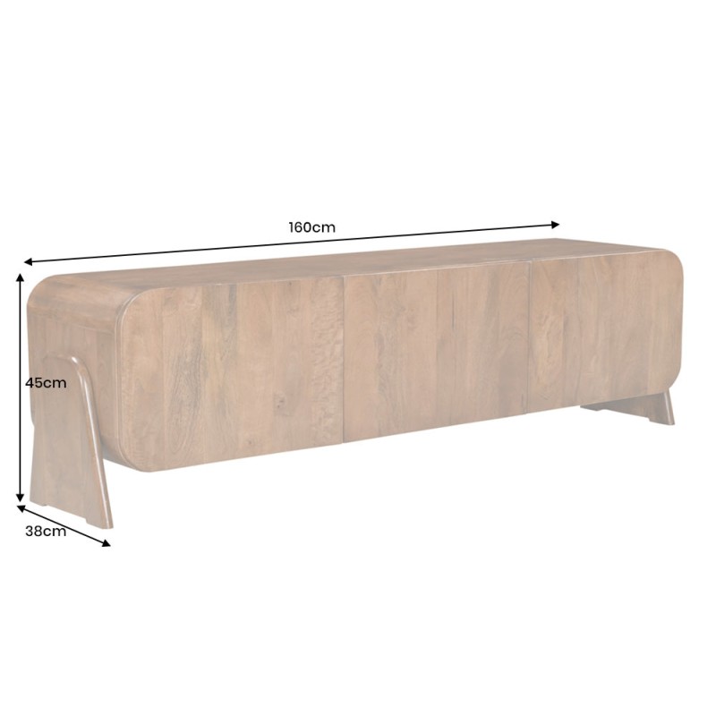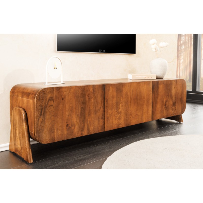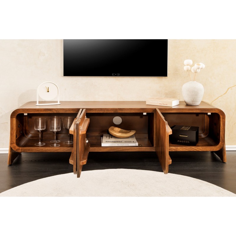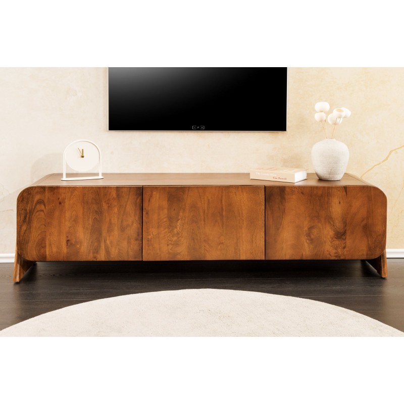 Ce meuble TV NATURA 160 cm en bois massif séduit par son design organique et son allure chaleureuse. Ses lignes douces et arrondies mettent en valeur l’esprit artisanal de la collection, offrant un rendu naturel et authentique qui s’intègre parfaitement dans un salon moderne ou plus traditionnel.