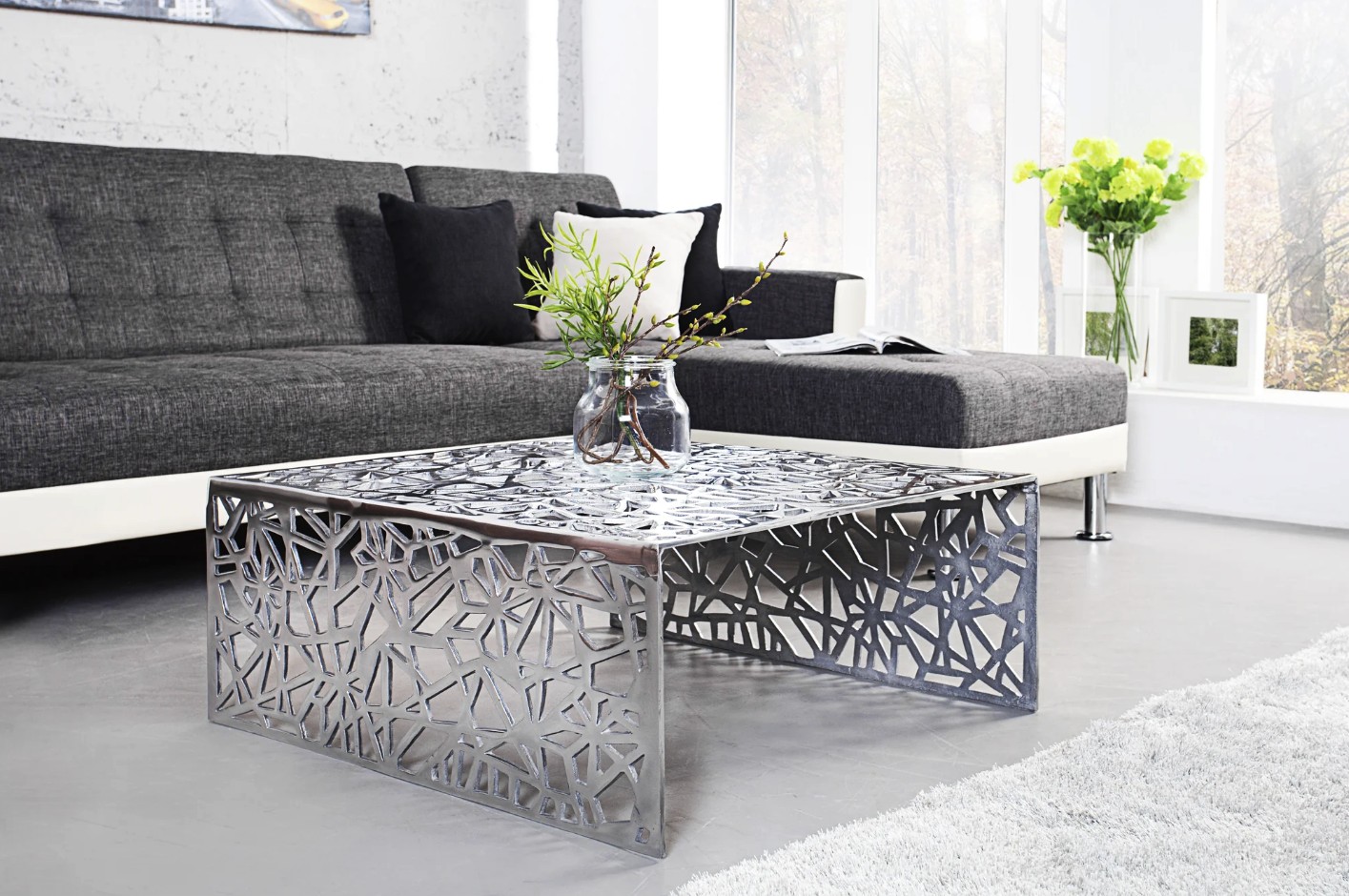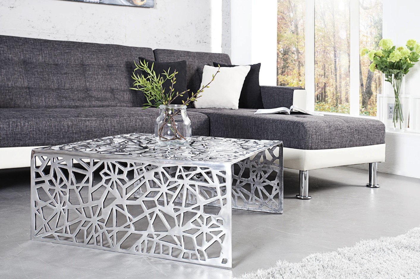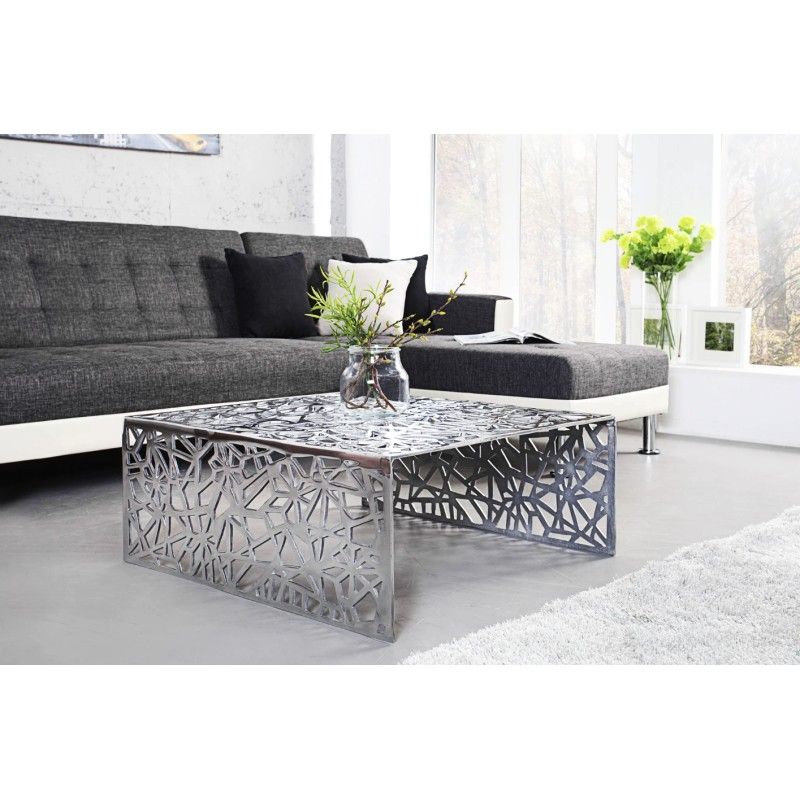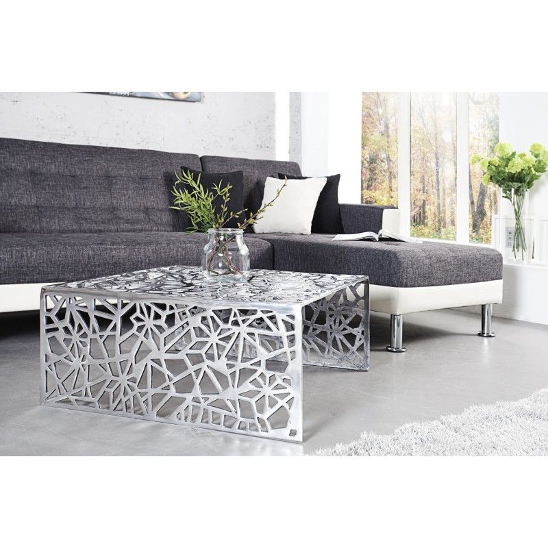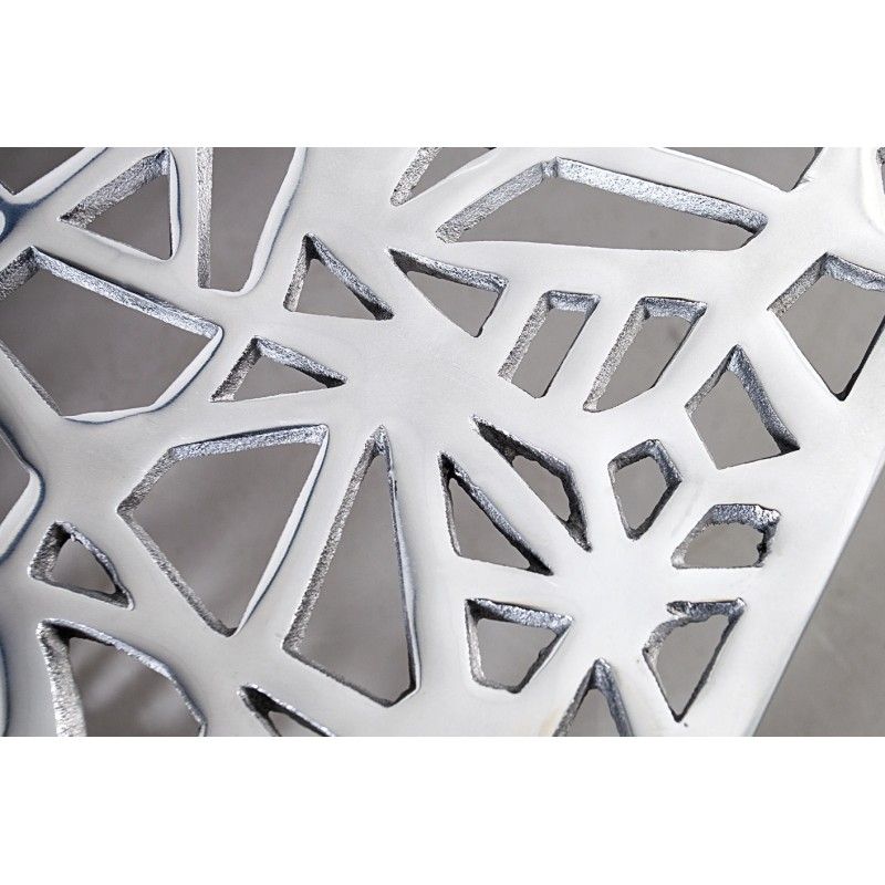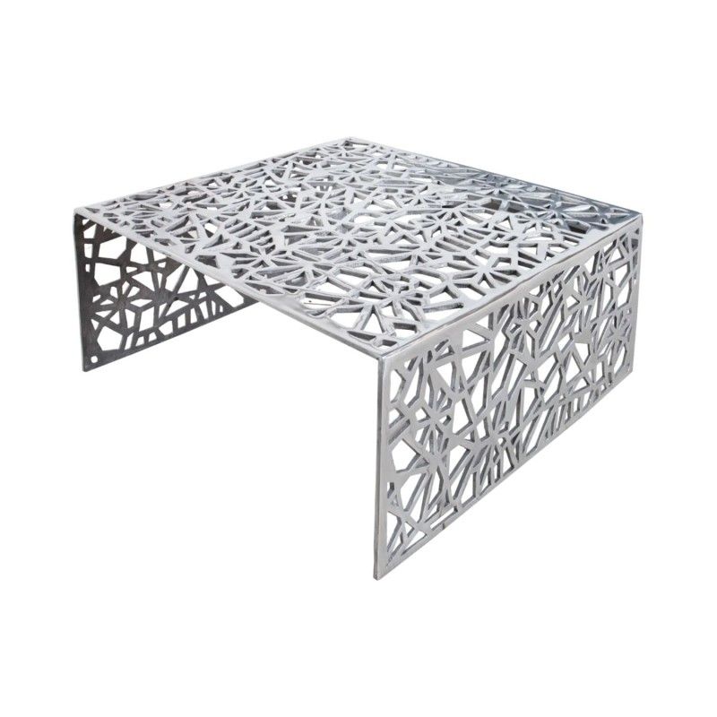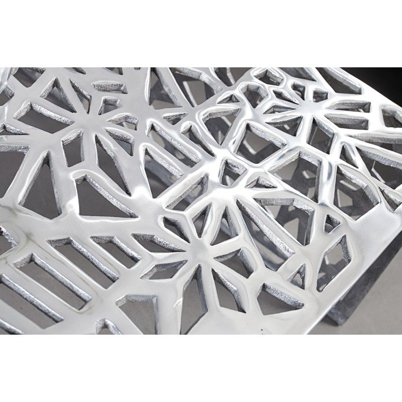 La table basse METRIX séduit par son design contemporain et son esthétique résolument graphique. Entièrement conçue en aluminium argenté, elle se distingue par ses motifs géométriques ajourés qui habillent aussi bien le plateau que les côtés, créant un véritable effet sculptural dans le salon.