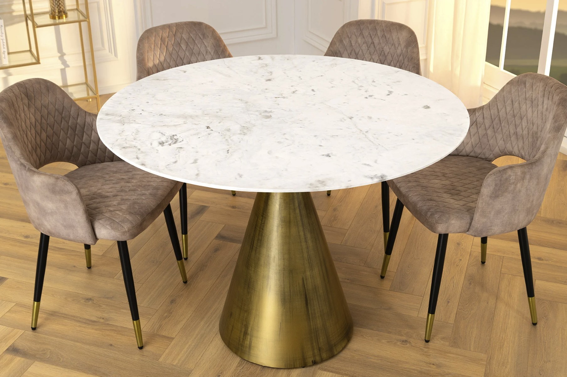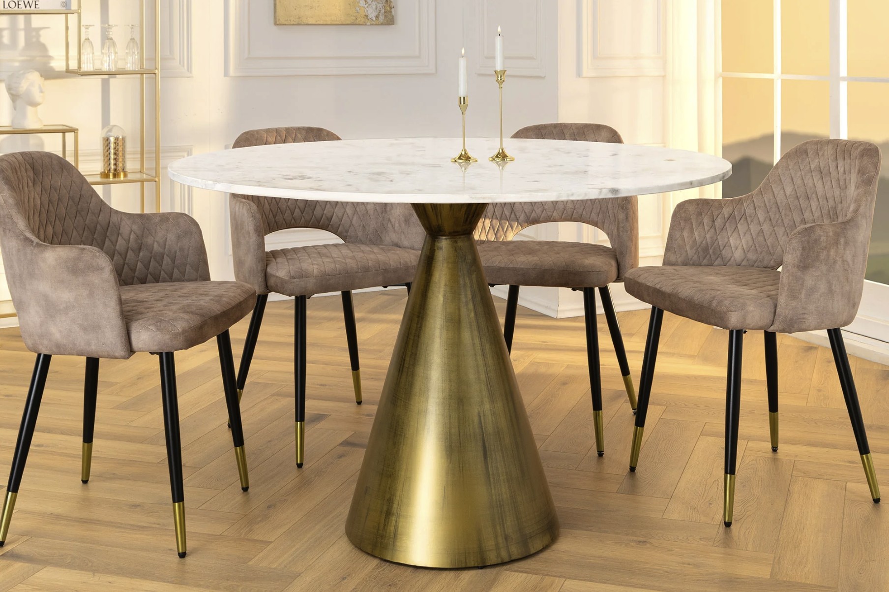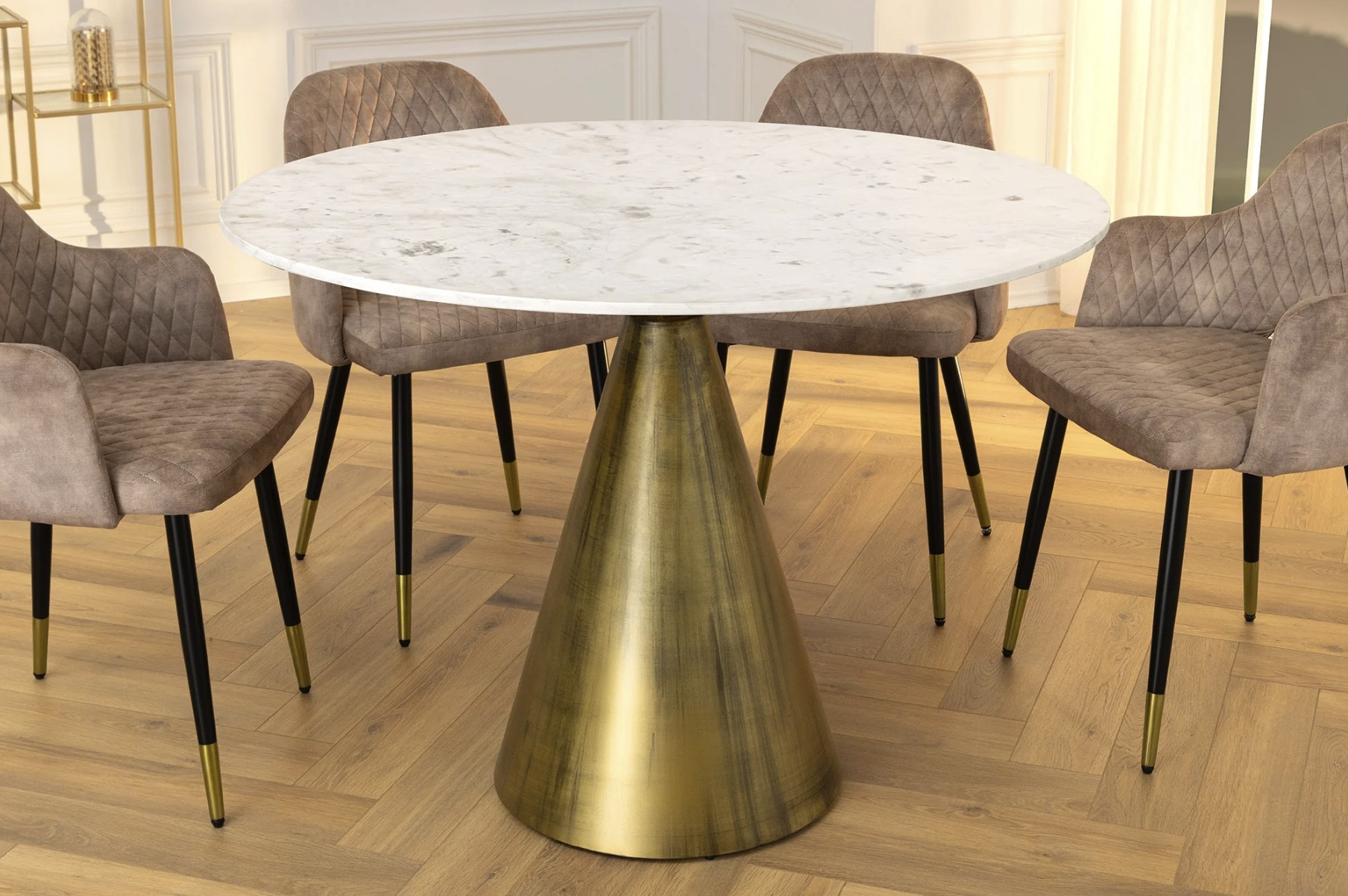 Avec son plateau rond en marbre blanc et sa structure en métal doré, la table SOLEA apporte une touche luxueuse à votre salle à manger. Chaque détail a été pensé pour marier robustesse et élégance, offrant ainsi une table aussi fonctionnelle qu’esthétique.