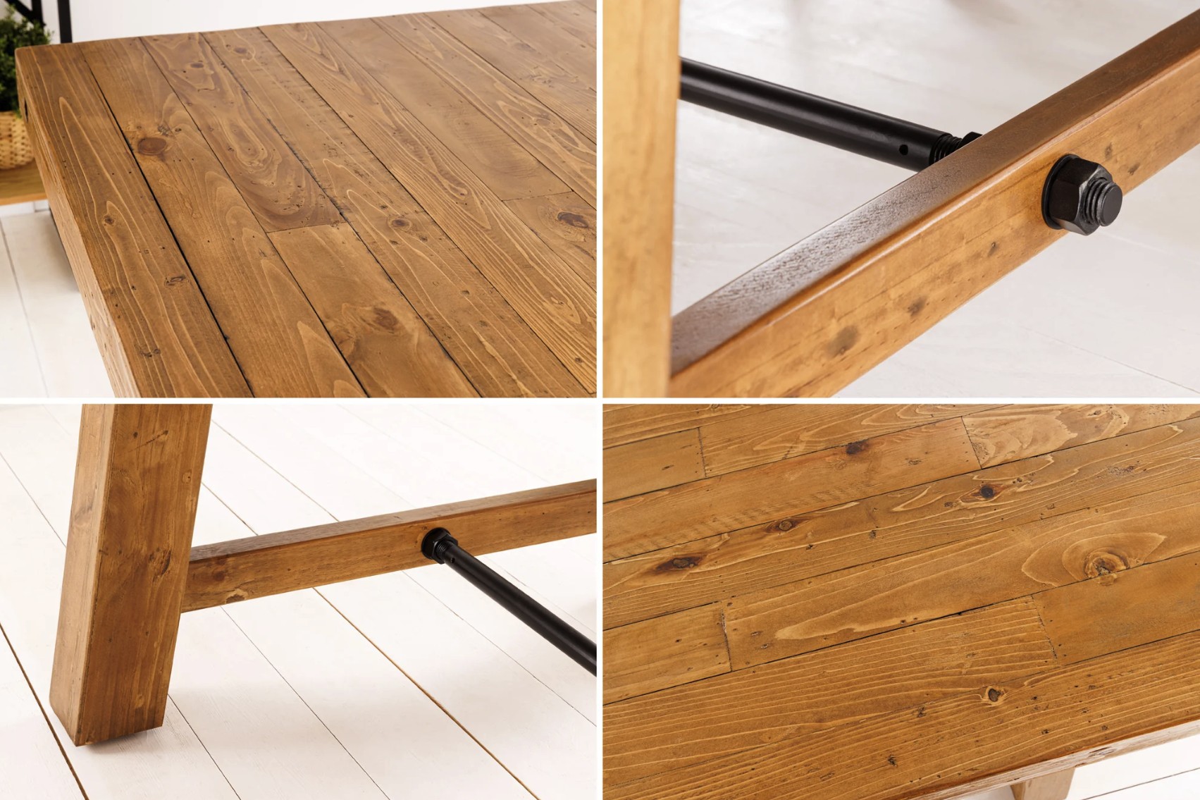 Avec ses dimensions généreuses de 400 cm, la table de salle à manger RANCHO est idéale pour accueillir de grands repas conviviaux. Conçue en bois massif de pin recyclé verni et renforcée par une structure en métal noir, elle allie charme rustique, durabilité et robustesse.