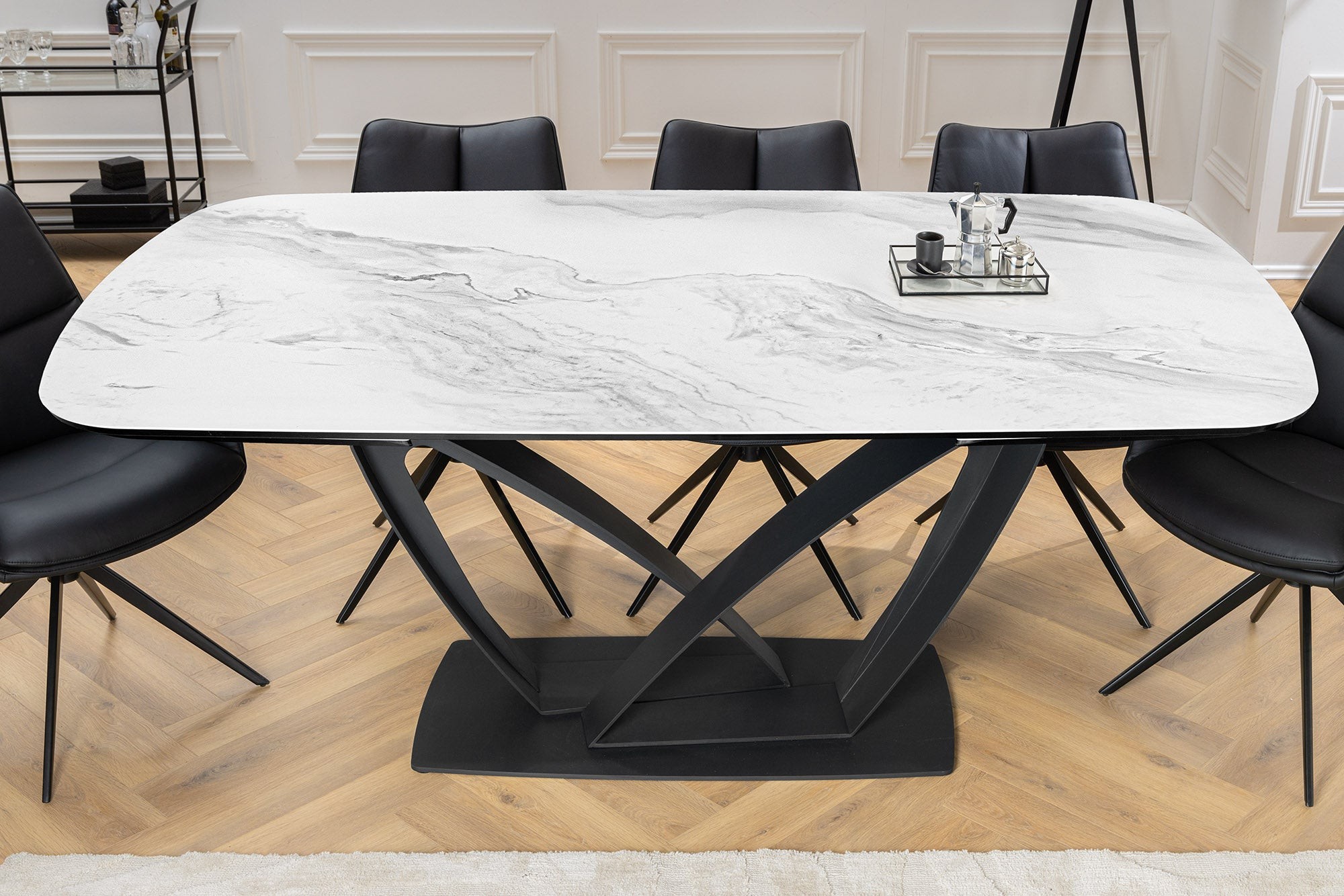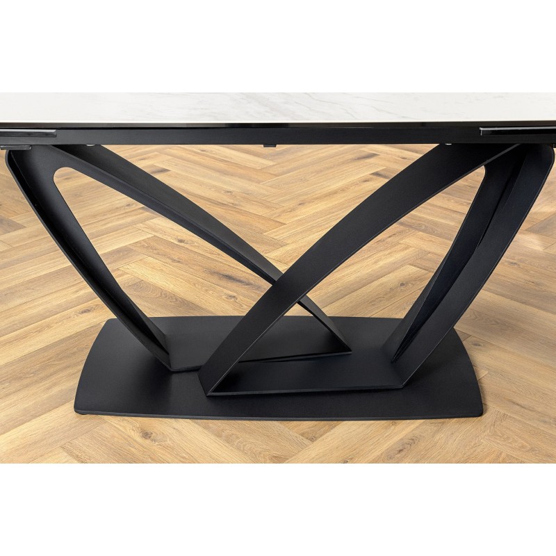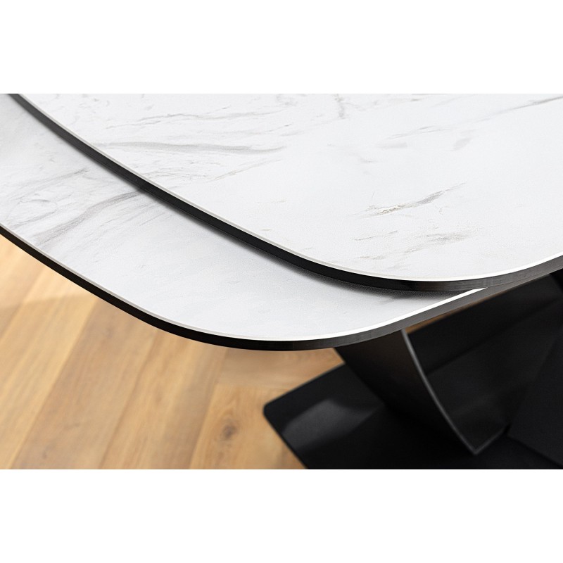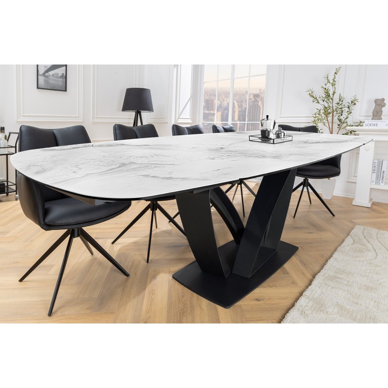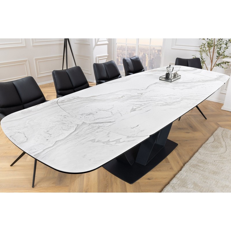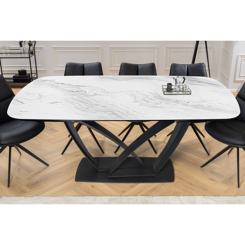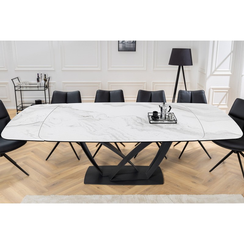 La table de salle à manger AZURA se distingue par son plateau en céramique effet marbre blanc qui apporte luminosité et élégance à votre intérieur. Sa structure en métal robuste assure une parfaite stabilité et une grande durabilité. Véritable atout déco, son design contemporain fait de cette table la pièce centrale de votre salle à manger.