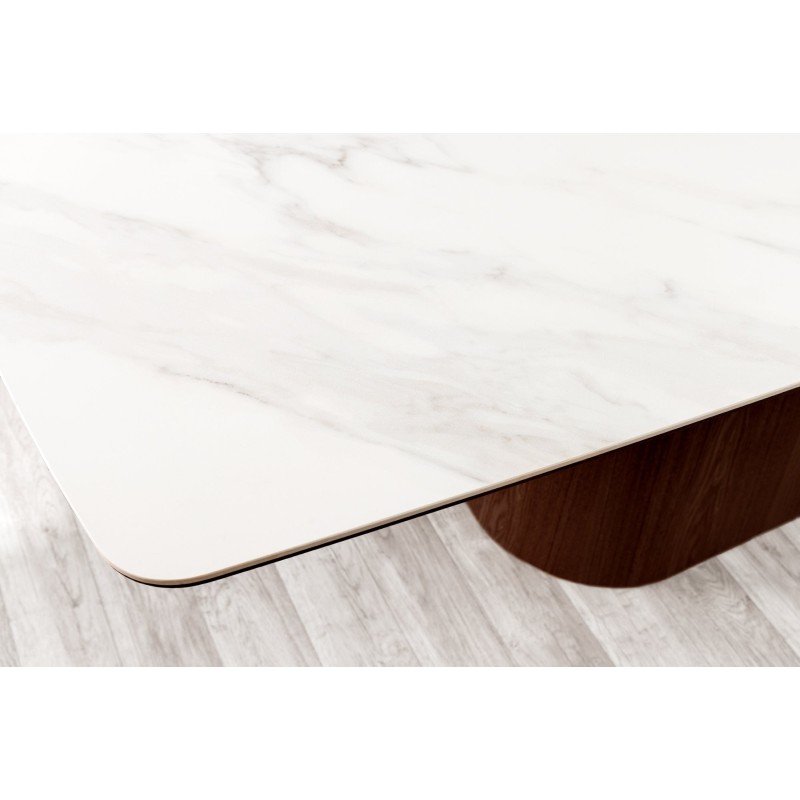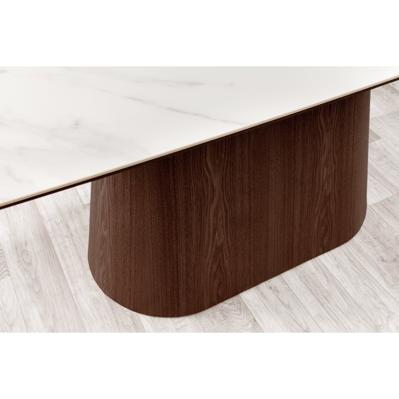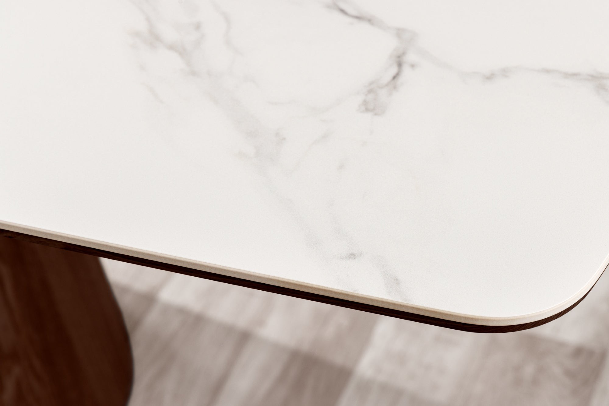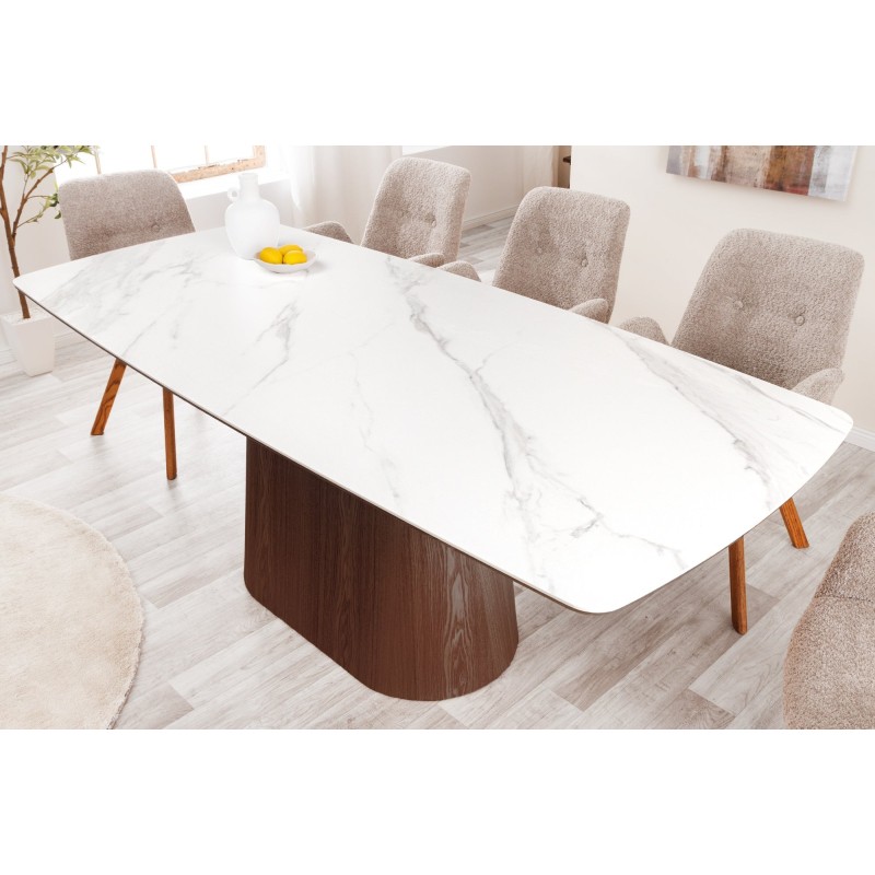 La table LUMEA combine élégance et praticité pour sublimer votre salle à manger. Son plateau en céramique effet marbre blanc, allié à une structure en bois foncé, apporte une atmosphère chic et chaleureuse à vos repas.