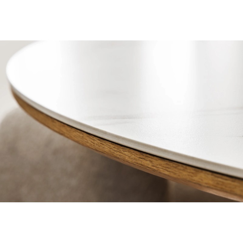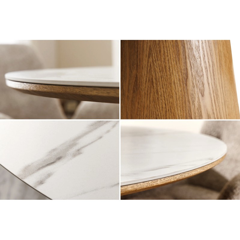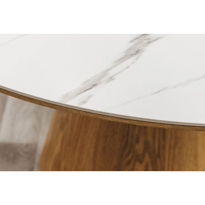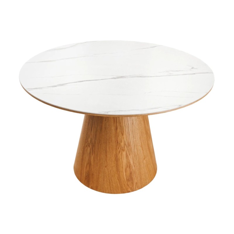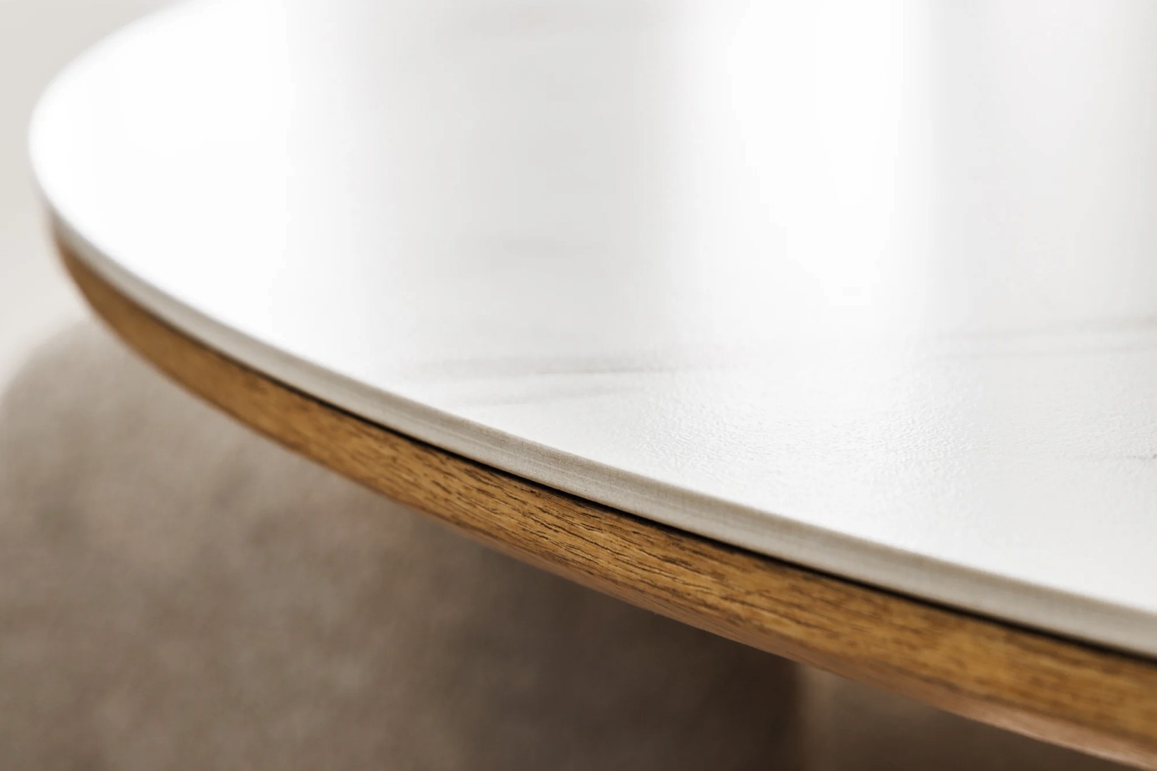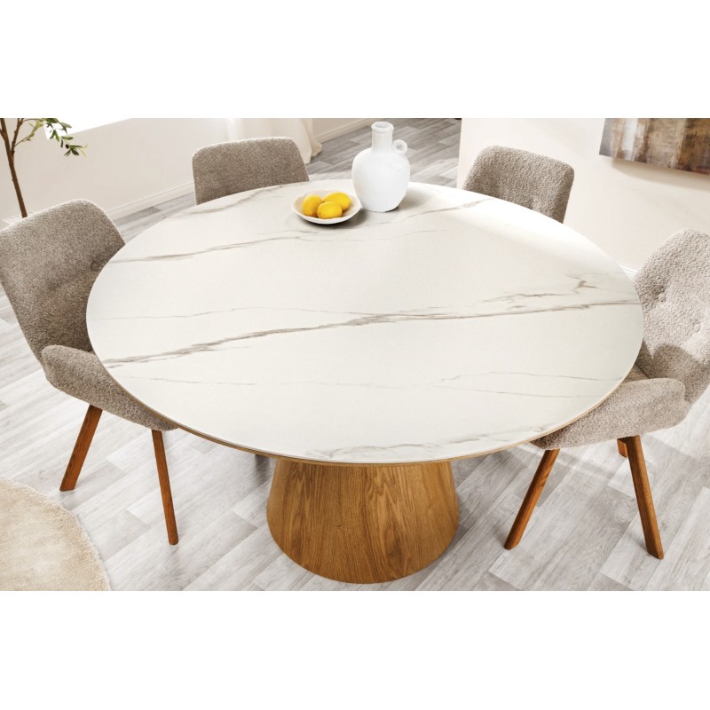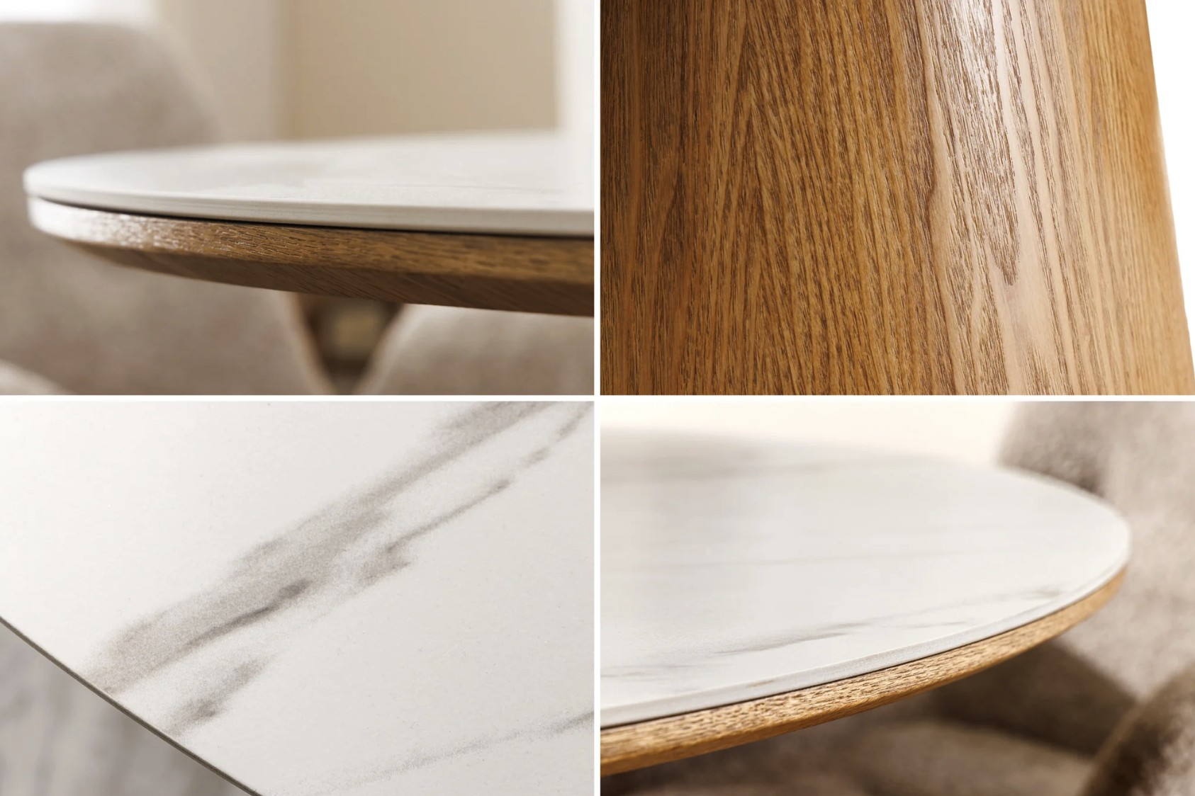 Alliez raffinement et robustesse avec la table LUMEA. Son plateau en céramique effet marbre blanc apporte luminosité et élégance, tandis que son pied en bois de noyer séduit par son design géométrique unique et sa solidité.