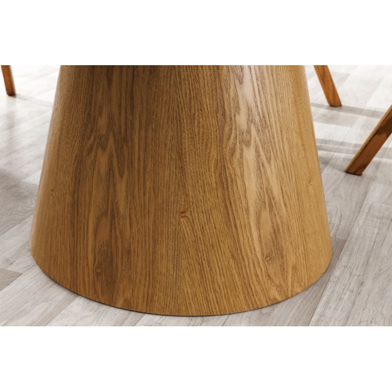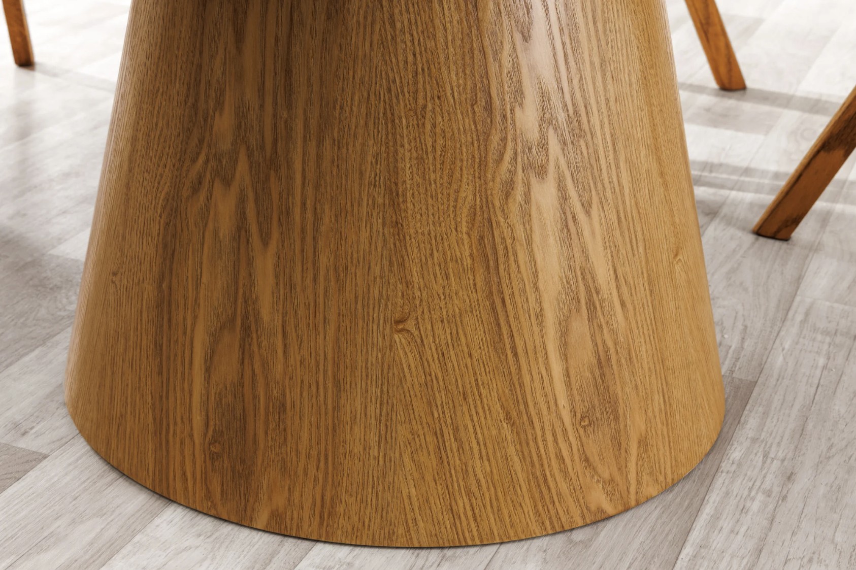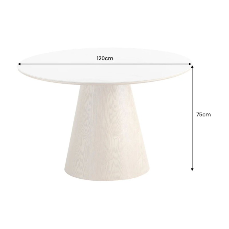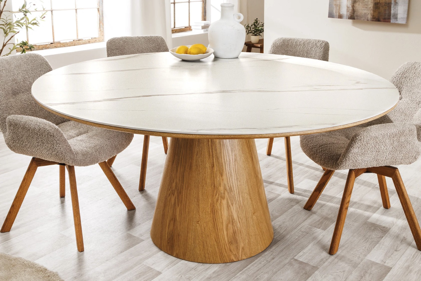 Avec ses dimensions de 120 cm de diamètre, la table ronde LUMEA est parfaite pour accueillir jusqu’à 6 convives. Sa base imposante, aux lignes géométriques (28 cm en haut, 60 cm en bas, hauteur 72,5 cm), garantit stabilité et modernité. Cette combinaison harmonieuse entre le noyer chaleureux et le marbre lumineux en fait un élément central de votre salle à manger.