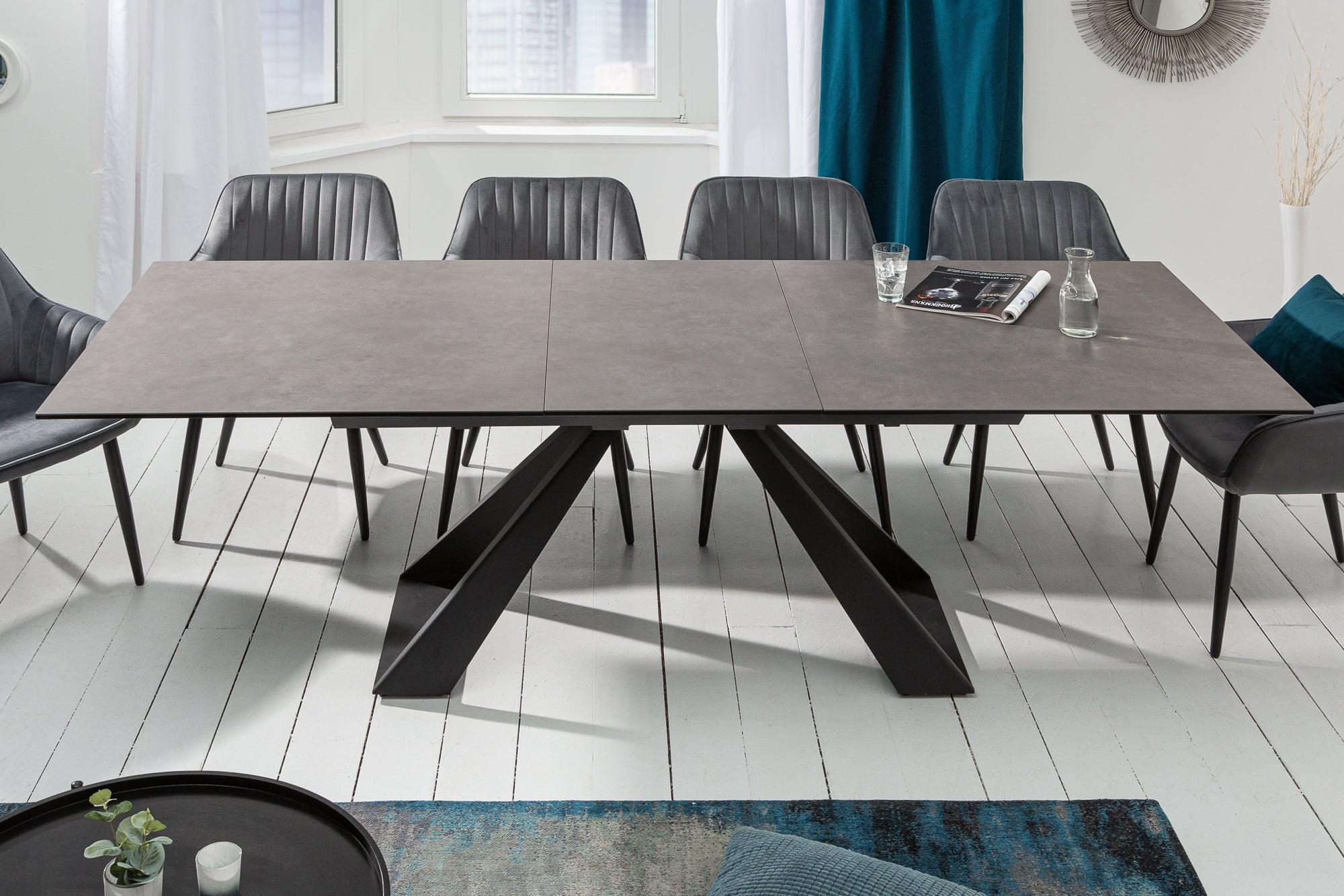 Apportez modernité et élégance à votre intérieur avec la table de salle à manger OBLIKA. Son plateau en céramique grise posé sur du verre trempé offre une surface résistante et facile d’entretien. Sa structure en métal anthracite au design géométrique lui confère un style contemporain et raffiné, parfait pour les intérieurs modernes.