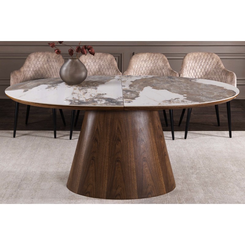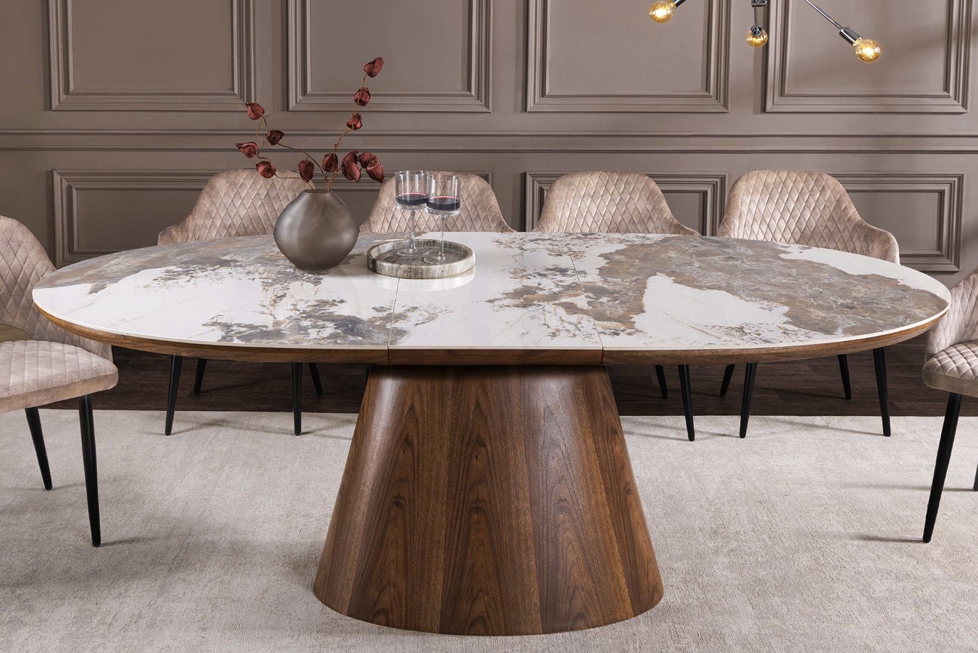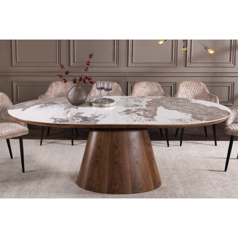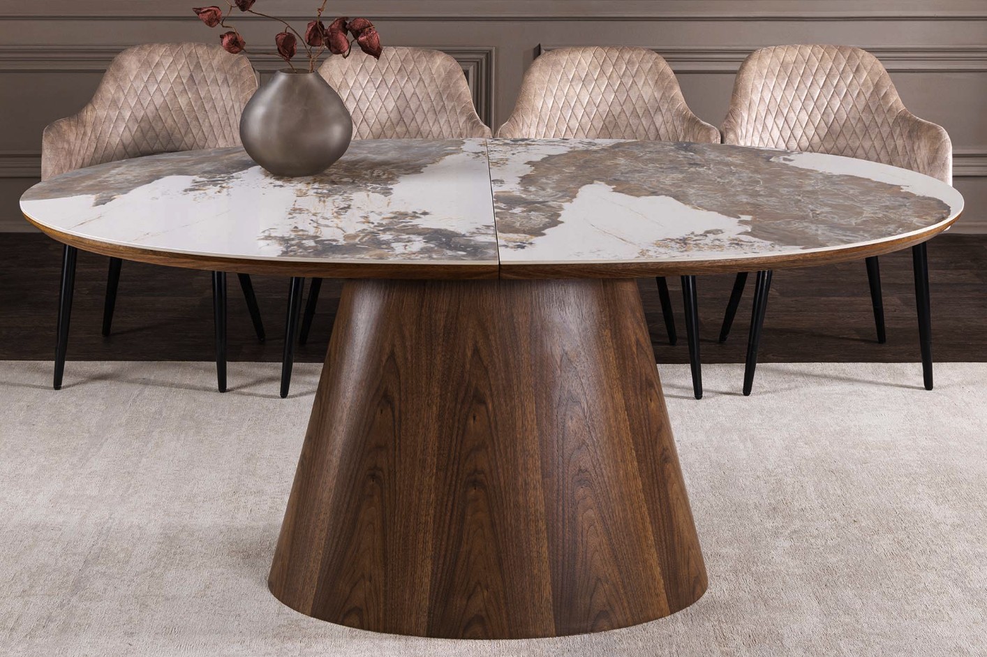 Cette table associe un plateau en céramique à une structure en MDF plaqué bois de noyer véritable, garantissant résistance, durabilité et facilité d’entretien. Son pied central aux dimensions généreuses assure une excellente stabilité tout en libérant l’espace pour les convives. L’aspect pierre du plateau apporte une touche sophistiquée et contemporaine à l’ensemble.