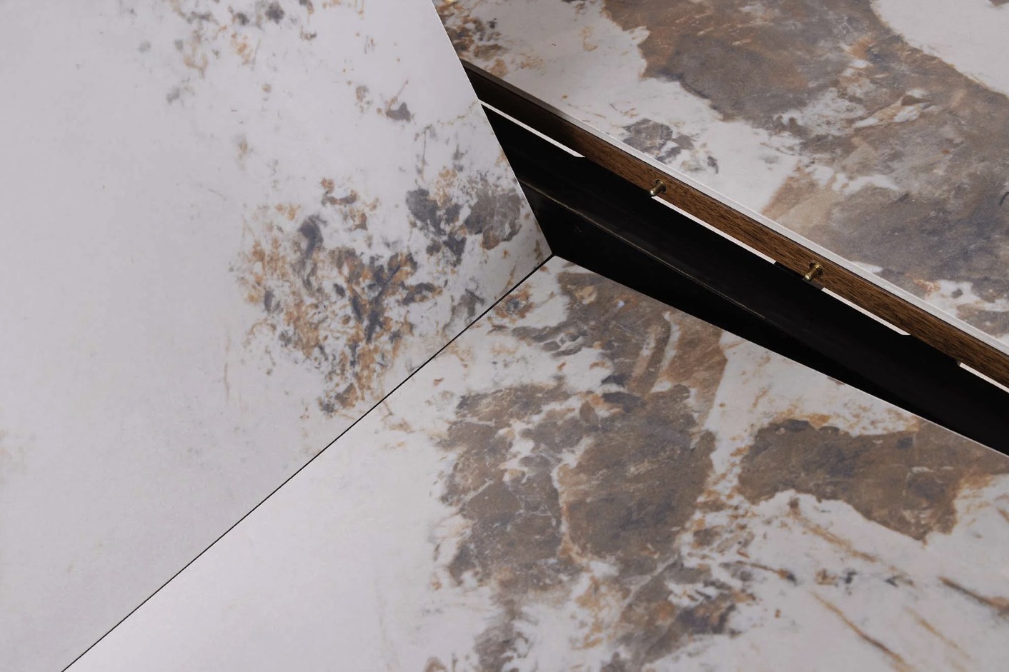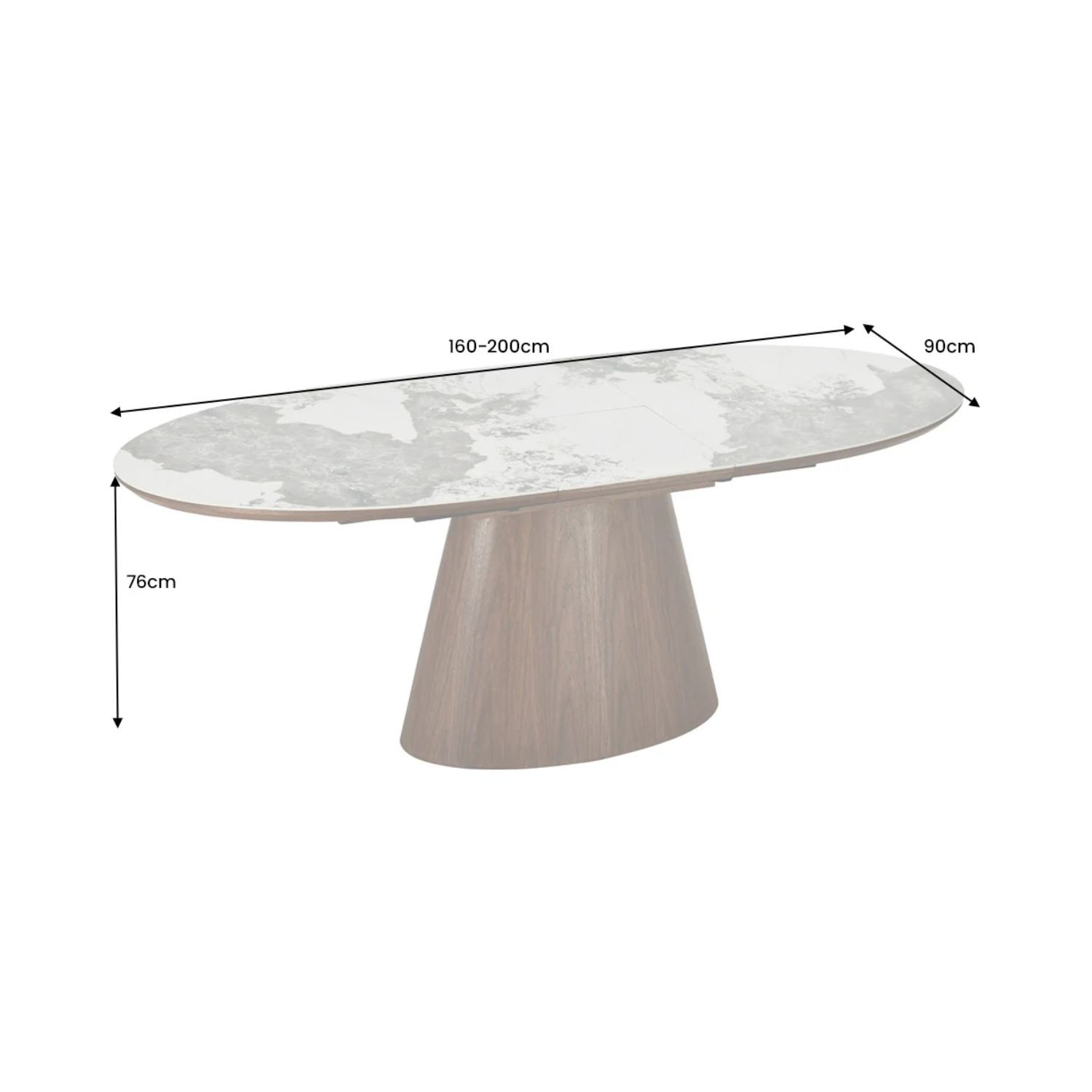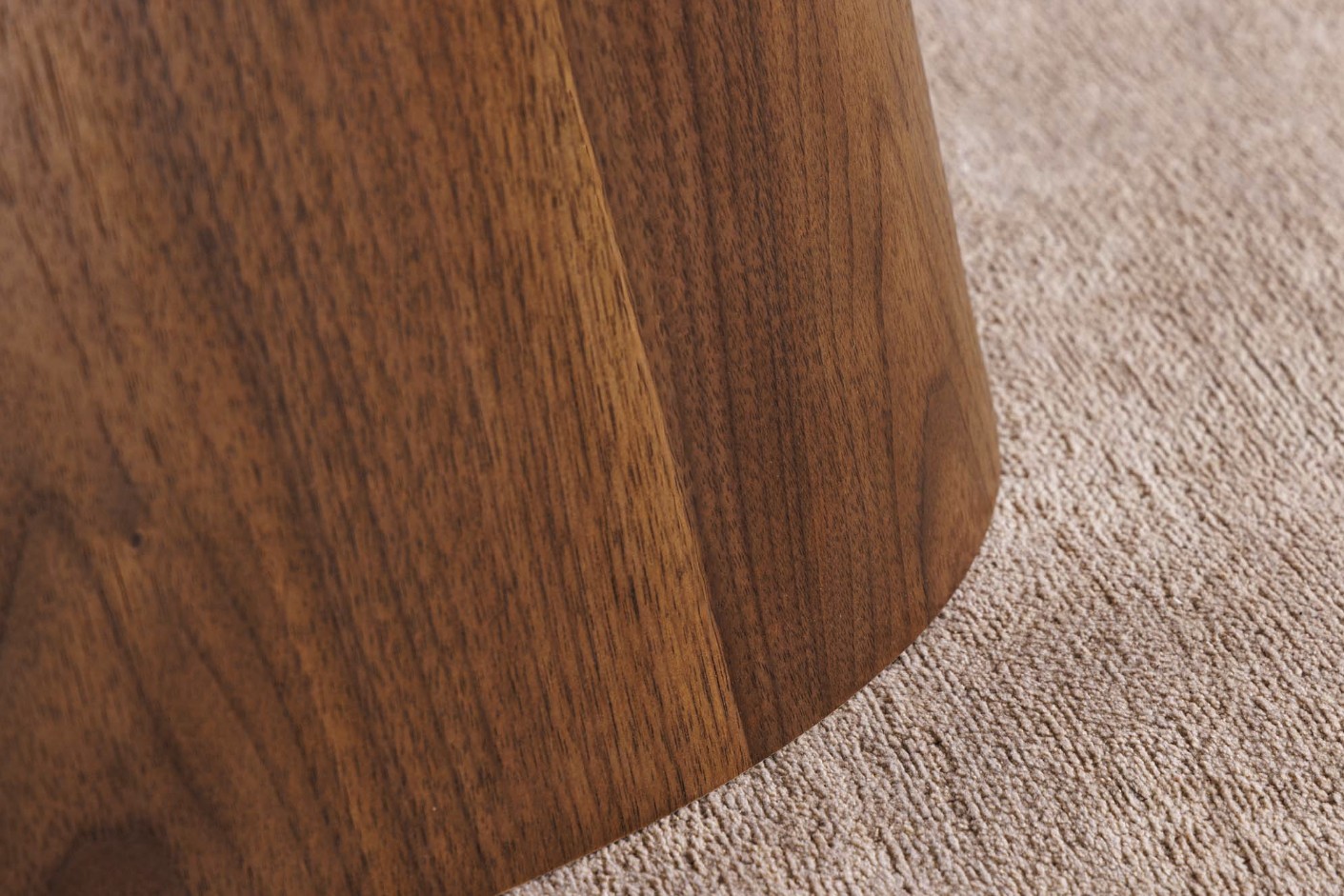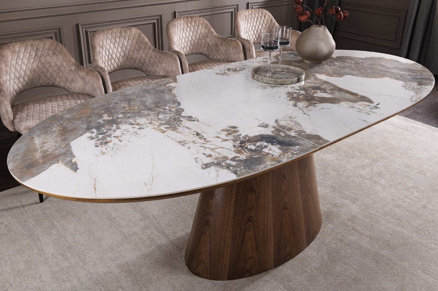 Cette table associe un plateau en céramique à une structure en MDF plaqué bois de noyer véritable, garantissant résistance, durabilité et facilité d’entretien. Son pied central aux dimensions généreuses assure une excellente stabilité tout en libérant l’espace pour les convives. L’aspect pierre du plateau apporte une touche sophistiquée et contemporaine à l’ensemble.
