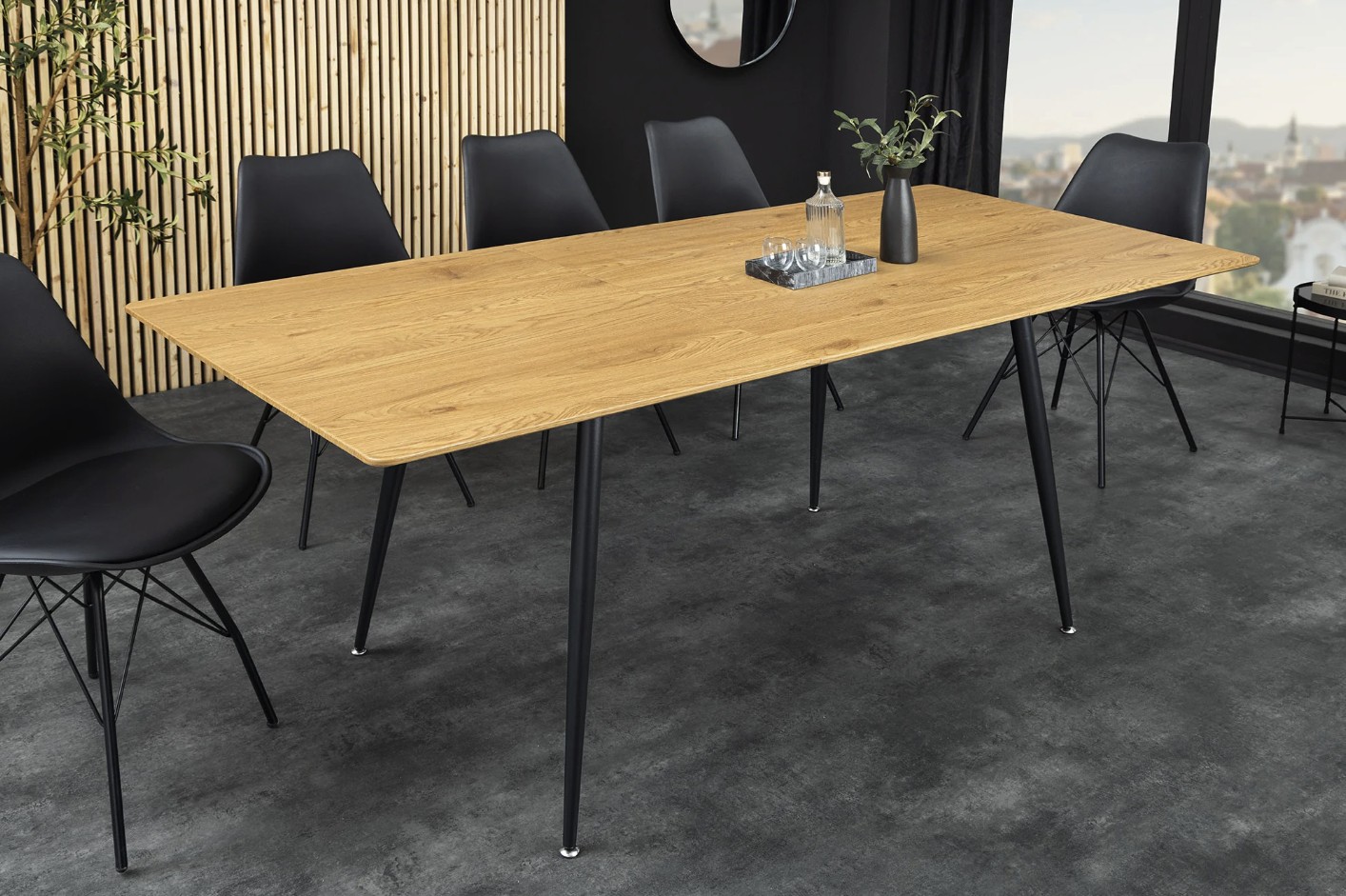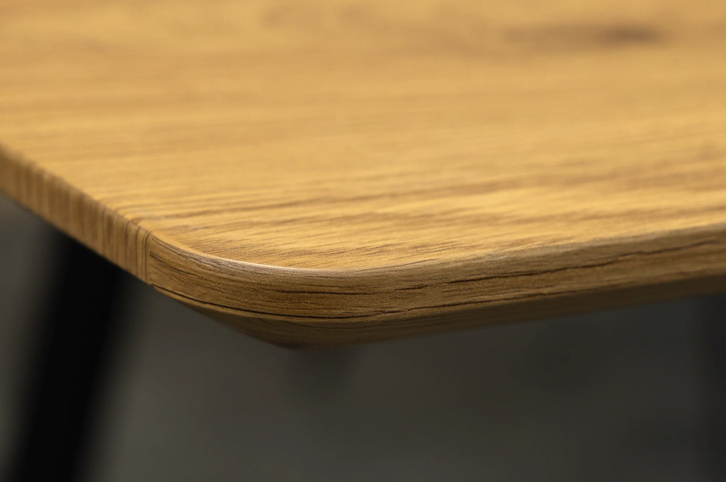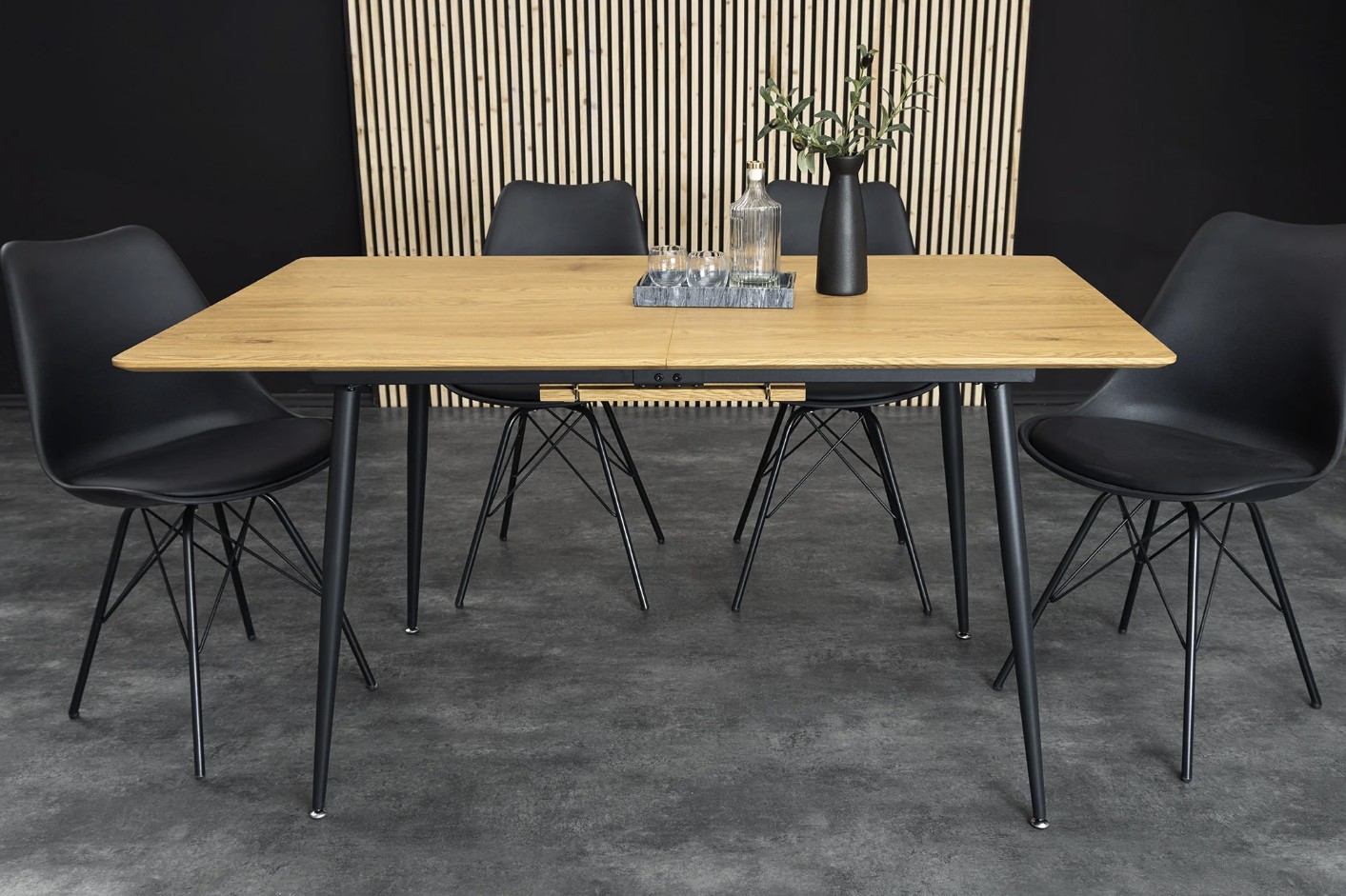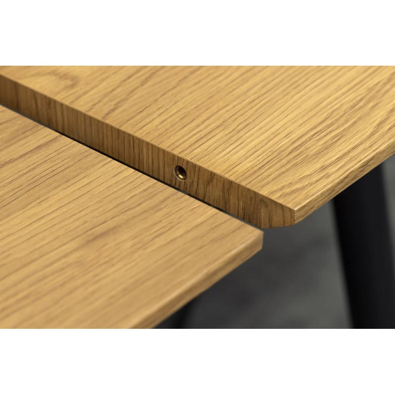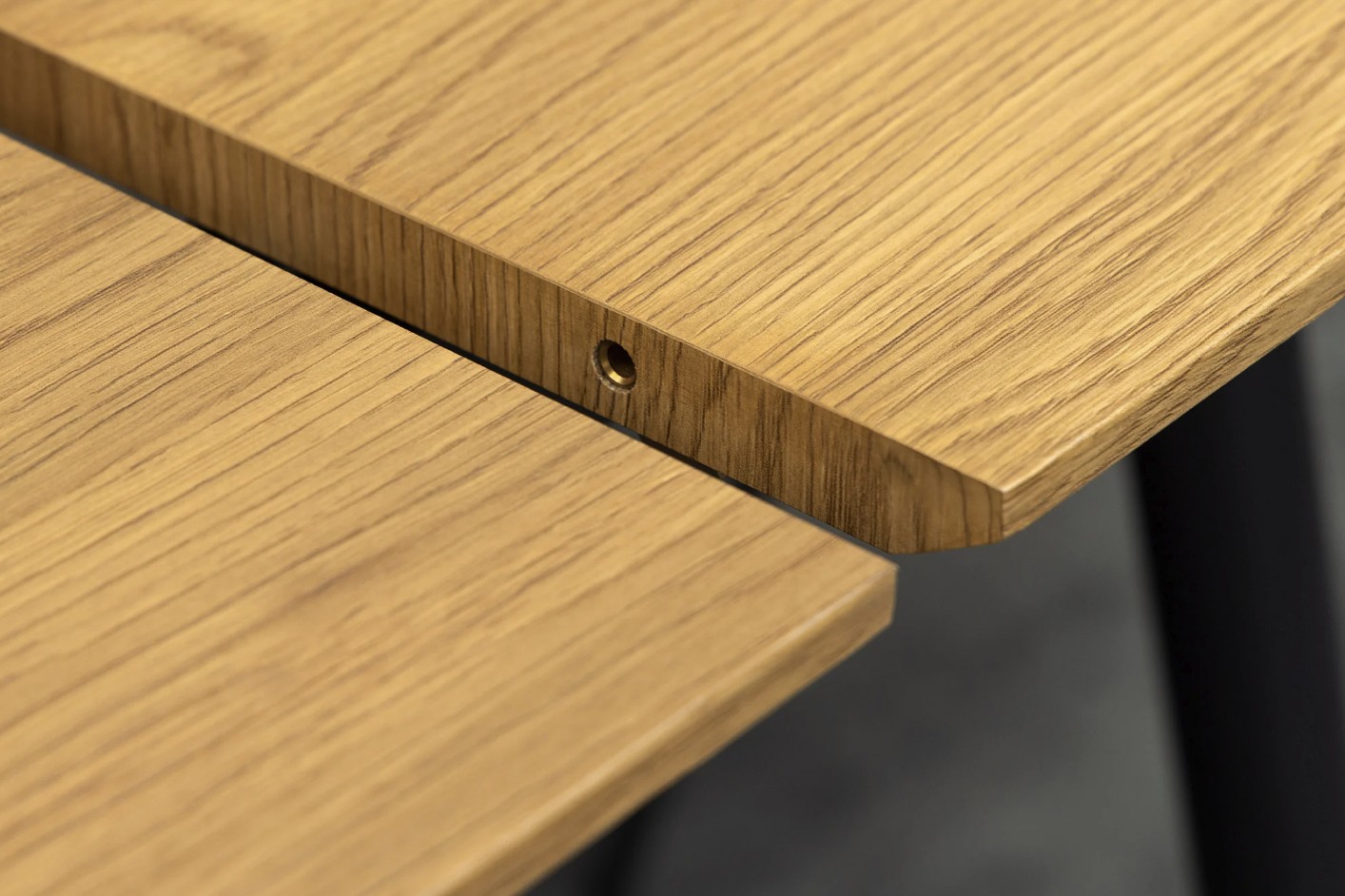 Cette table associe un plateau en MDF plaqué en véritable bois de chêne sauvage à des pieds en métal, garantissant solidité et stabilité. Le plateau biseauté apporte une touche design raffinée, tandis que le système extensible permet d’optimiser l’espace sans compromis sur l’esthétique.