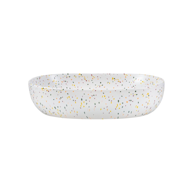Su forma ovalada con líneas suaves crea un ambiente elegante y equilibrado en su baño. El acabado mate refuerza su aspecto natural y de moda, mientras que los destellos multicolores sutilmente integrados en fondo blanco brindan carácter y personalidad sin sobrecargar la decoración. El desagüe clic clac a juego completa el conjunto con un sistema de apertura simple y práctico por presión.