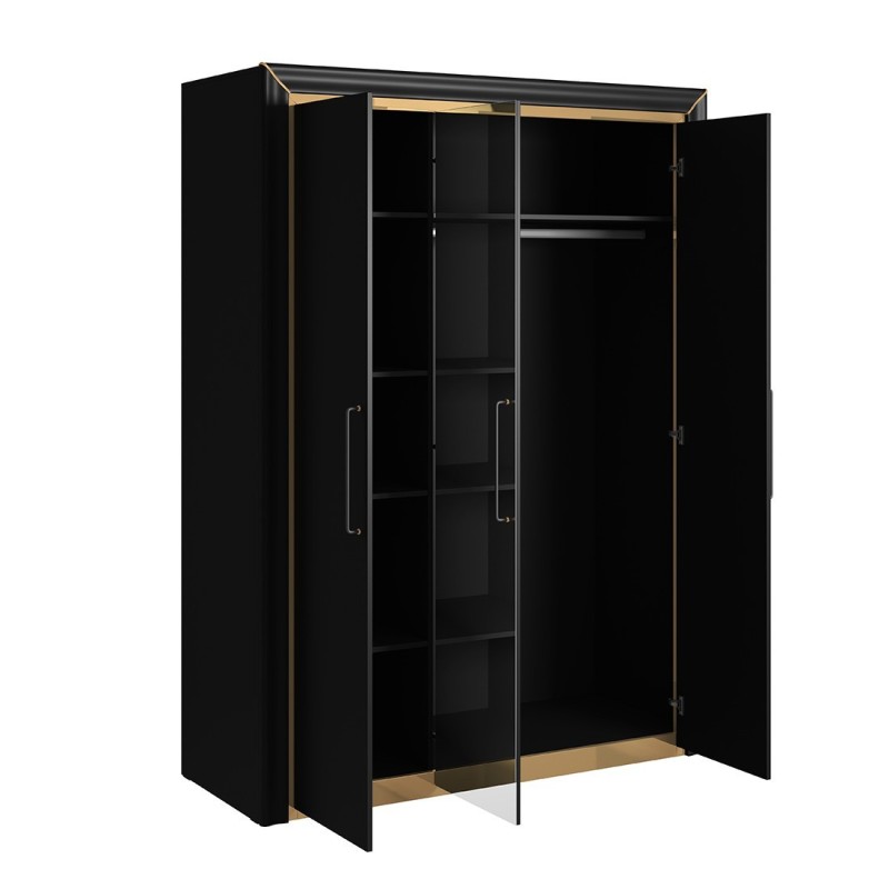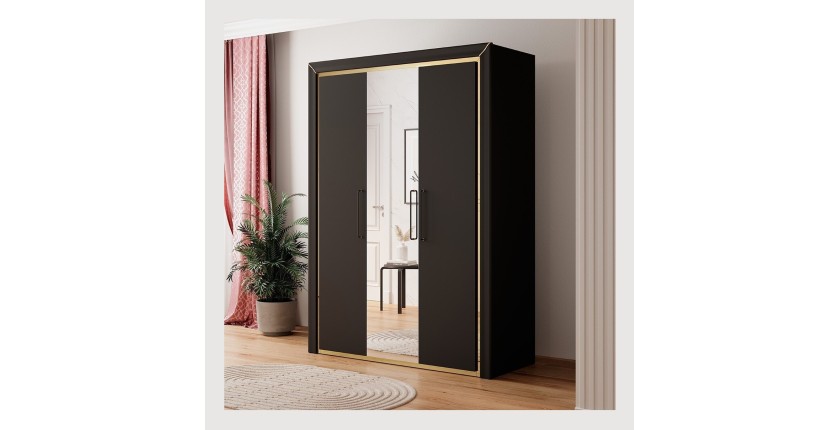 Cette garde robe sublimera votre chambre avec son coloris noir mat et son grand miroir présent sur la porte centrale. L'intérieur est muni de nombreux espaces de rangements : une grandes penderies et 5 étagères afin d'en faire un dressing qui accueillera aisément toute votre garde-robe.