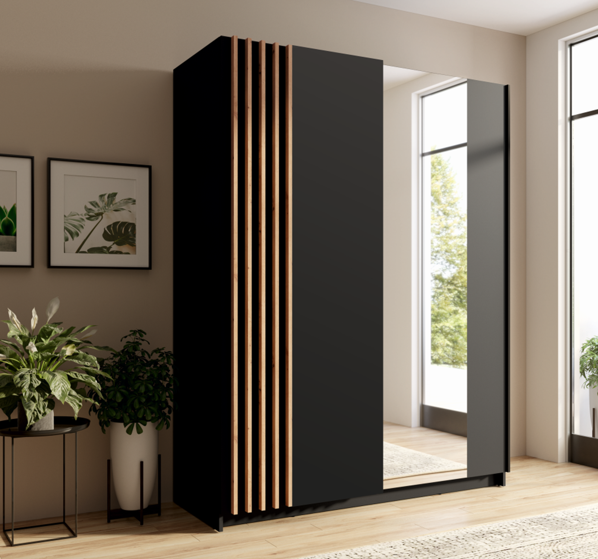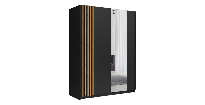 L'armoire VARIA en coloris noir et chêne est idéale pour ajouter une touche moderne et élégante à votre chambre. dotée de deux portes coulissantes, cette armoire maximise l'espace disponible tout en offrant un accès facile à vos vêtements et accessoires. ses dimensions de 150x198,5x63,5 cm offrent un espace de rangement spacieux, parfaitement adapté à une utilisation quotidienne. l'association du noir et du chêne apporte un contraste visuel élégant et contemporain.
