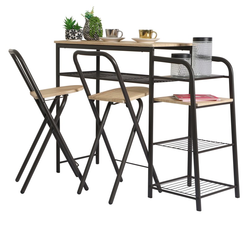 Optimisez votre espace avec cet ensemble de bar composé d’une table haute et de 2 tabourets pliables. Idéal pour un studio, une cuisine ou un petit salon, cet ensemble au plateau en MDF couleur bois et à la structure en métal noir combine style et fonctionnalité. Ses dimensions compactes de 89x40x129 cm en font un choix parfait pour les petits espaces, tout en offrant un coin repas pratique et esthétique. Les tabourets pliables permettent un rangement facile lorsqu'ils ne sont pas utilisés.