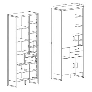 - CARACTÉRISTIQUES : Bibliothèque avec 3 portes battantes, 2 tiroirs et de nombreuses étagères. Grand espace de rangement grâce à ses nombreuses niches.