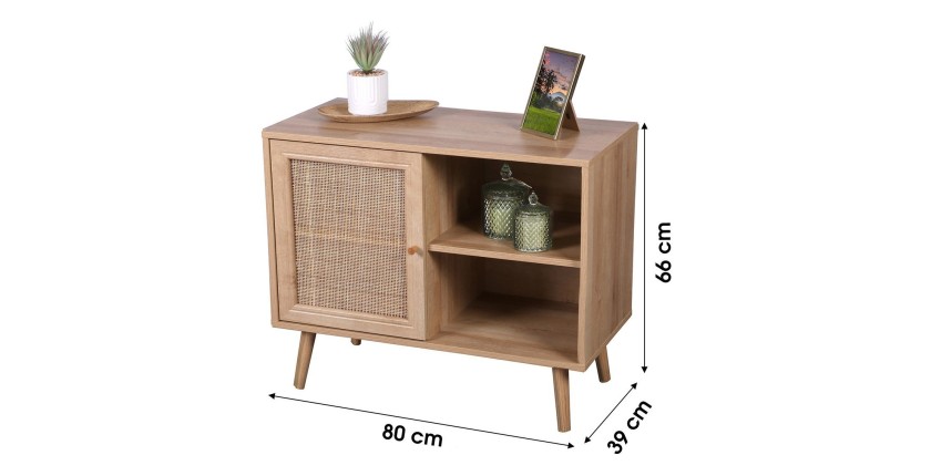 Apportez une touche de style scandinave à votre intérieur avec la commode ALTA. Ce meuble compact de 80 cm de largeur et 66 cm de hauteur est équipé d'1 porte en maillage rotin, 2 niches apparentes et 2 niches derrière la porte pour un rangement optimal. Ses pieds design inclinés et son mélange de bois MDF et rotin ajoutent une touche naturelle et chaleureuse à votre espace.