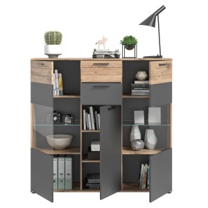 Le Buffet haut SELMA, en gris anthracite et chêne clair, est le meuble idéal pour allier fonctionnalité et esthétique dans votre salon. Avec sa porte vitrée et ses dimensions optimisées, il offre un espace de rangement élégant et pratique pour vos objets décoratifs.