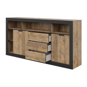 Le buffet haut MEUNIER allie style loft et rangement généreux : il dispose de 2 portes coulissantes en panneau chêne Samdal, de 3 tiroirs Push-to-Open et de 6 niches ouvertes pour exposer votre vaisselle et vos objets déco. Les chants en noir mat créent un contraste élégant, parfait pour votre salon ou votre salle à manger.