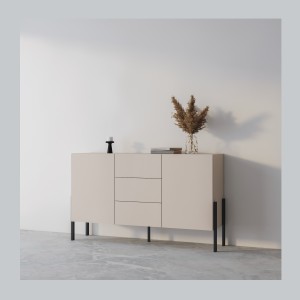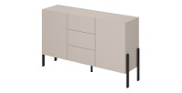 Ce buffet de la collection Salma marie une finition deep matte beige cashmere à des touches noir mat. Ses deux portes et trois tiroirs, dotés du système Push-to-Open, offrent une ouverture sans poignée visible, tandis que les pieds en métal assurent robustesse et élégance.
