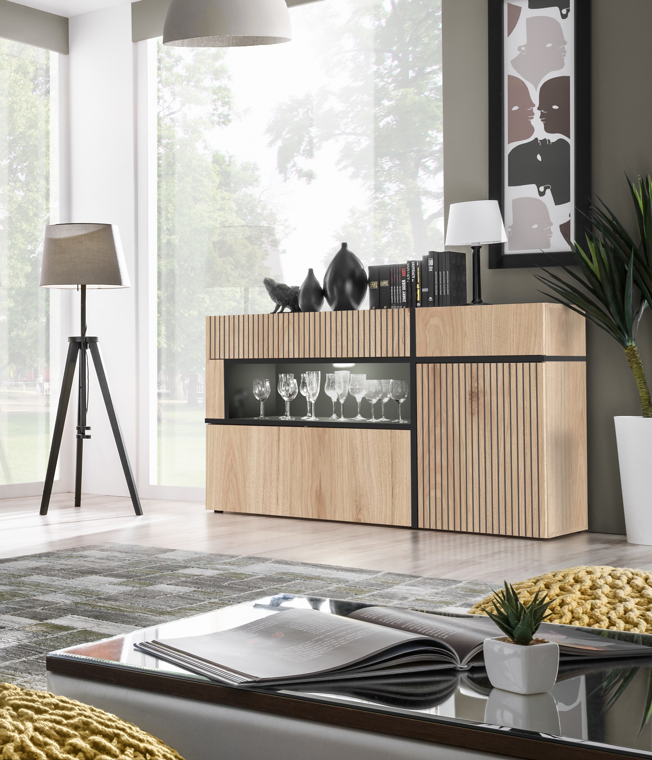 Donnez du caractère à votre intérieur avec le buffet bas CRISS. Ce meuble au style industriel combine chêne clair et noir avec des façades à rayures imprimées pour un rendu unique et élégant. Idéal pour le salon ou la salle à manger, il associe esthétique et praticité grâce à ses nombreux rangements.
