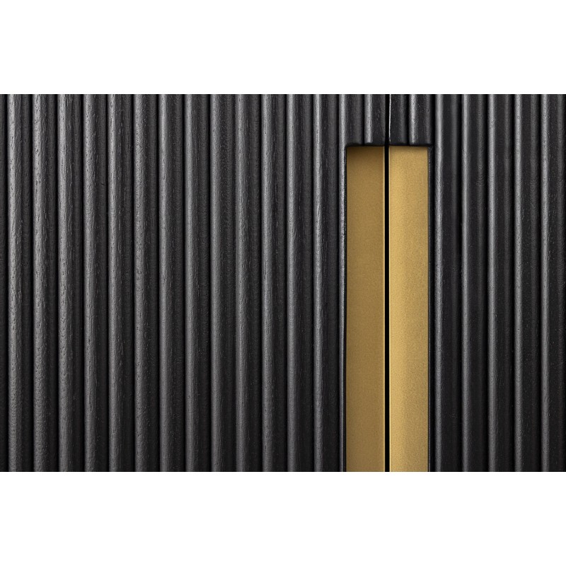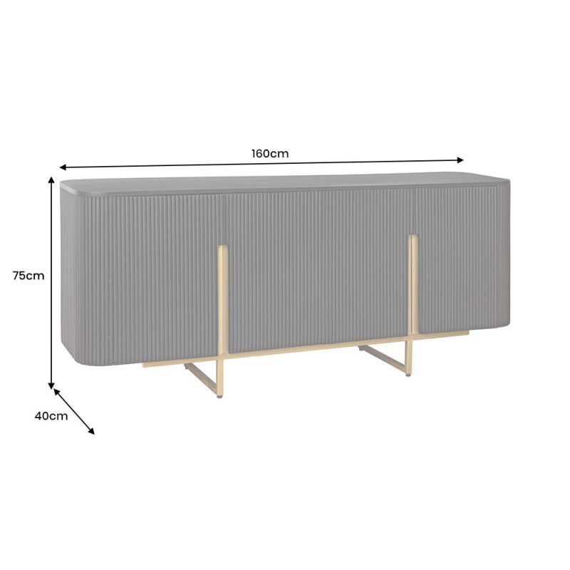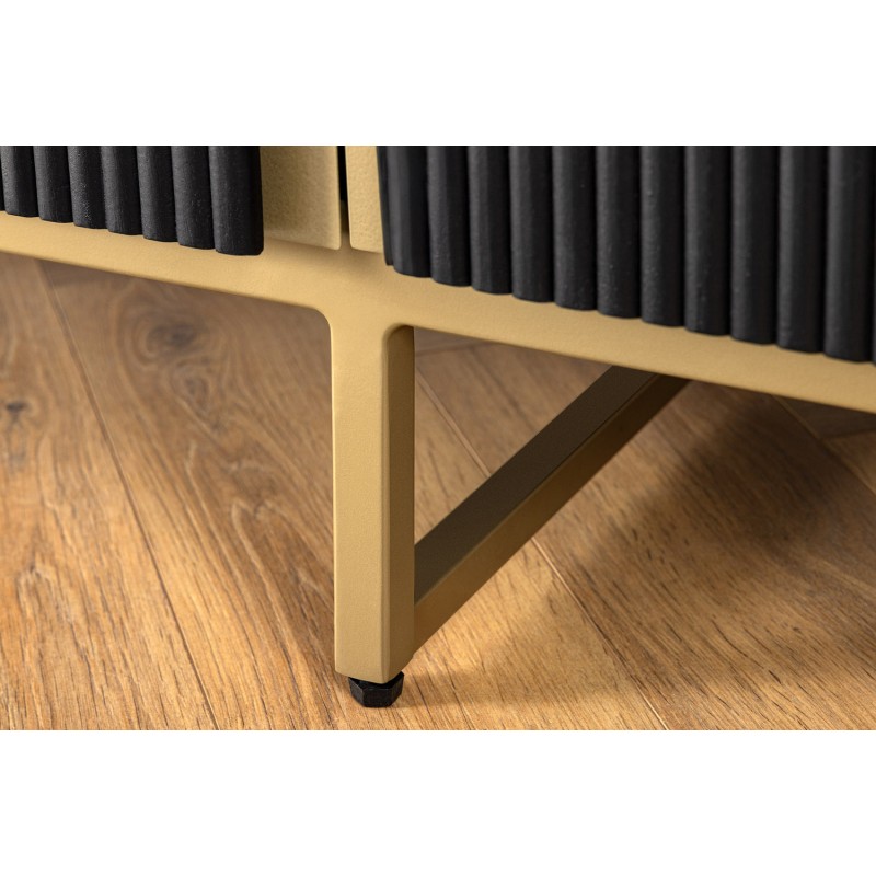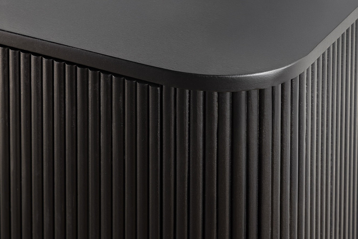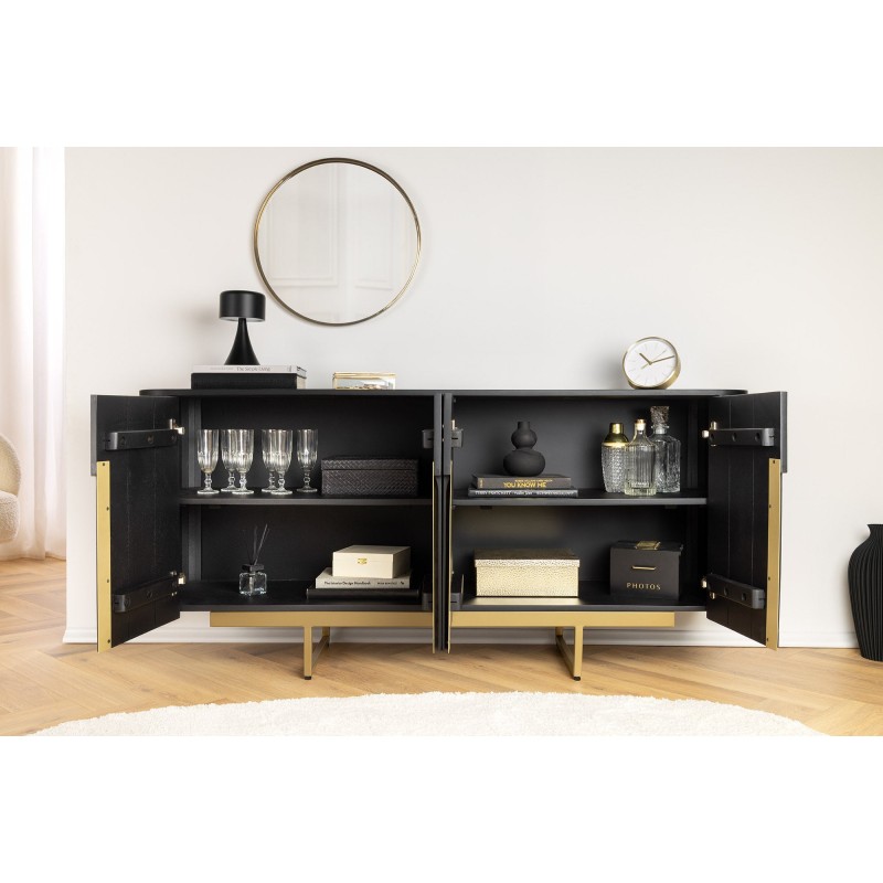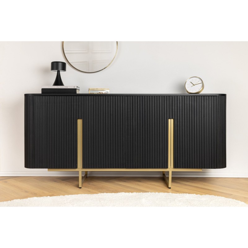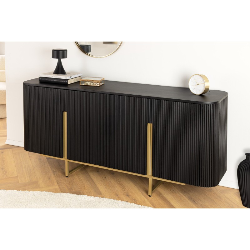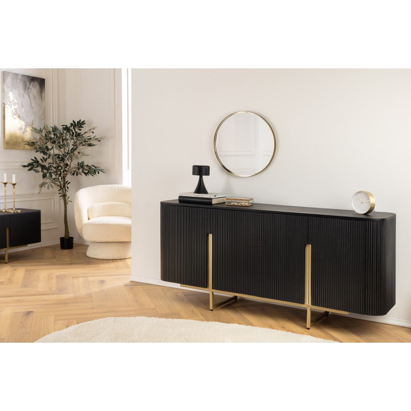 Apportez une touche luxueuse et sophistiquée à votre intérieur avec ce buffet ORION 160 cm. Conçu en bois de manguier, panneaux de particules et MDF de première qualité, il séduit par son coloris noir élégant associé à un piètement doré en métal. Ses lignes verticales sculptées sur les façades lui confèrent un look unique et résolument design.