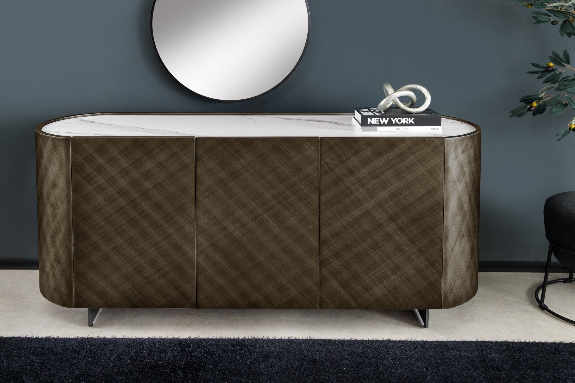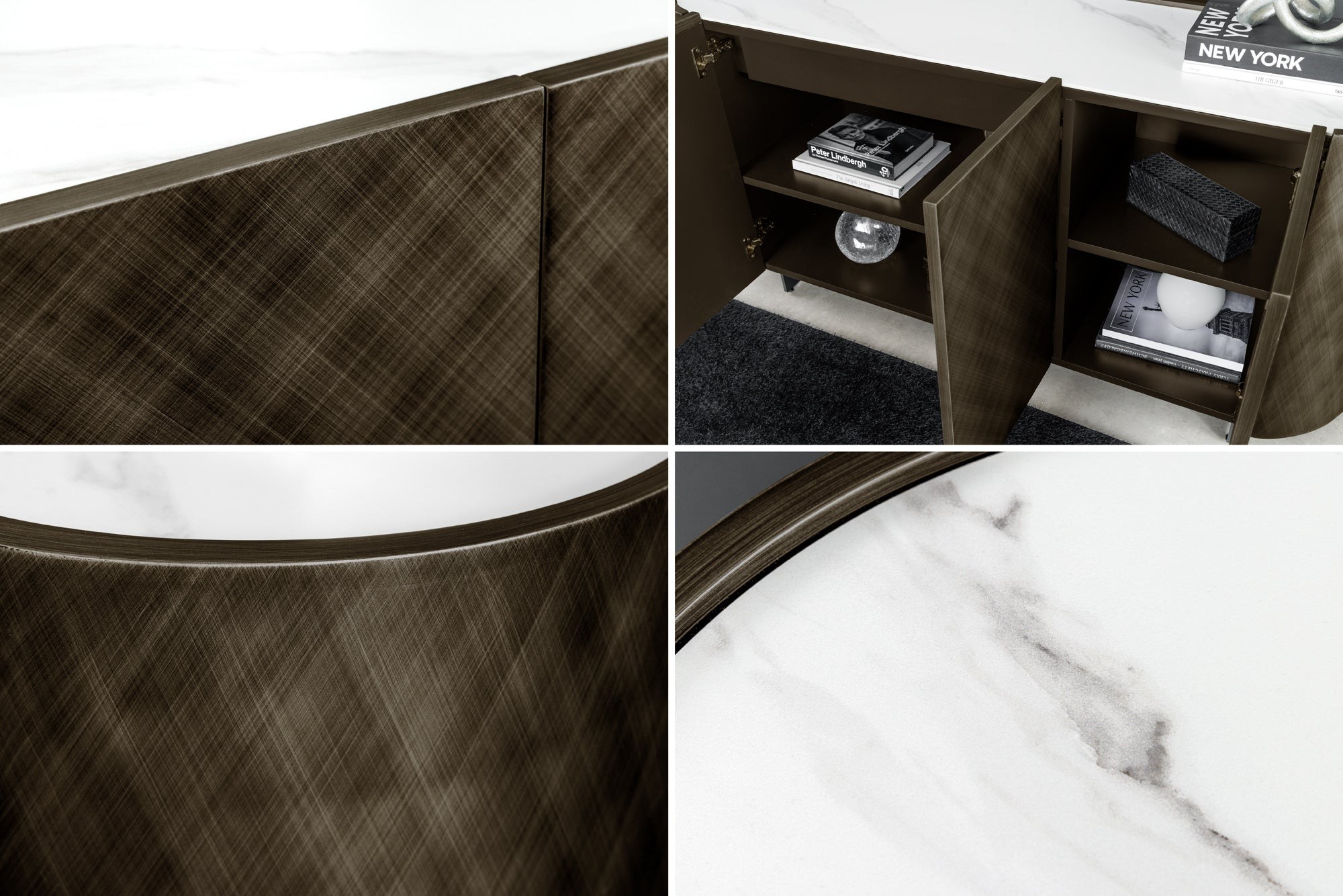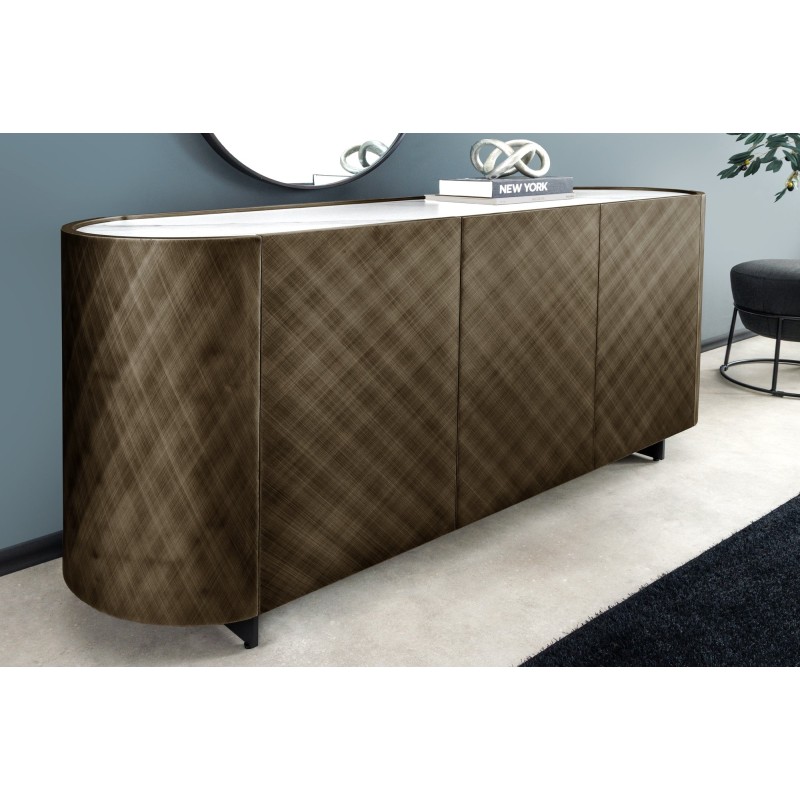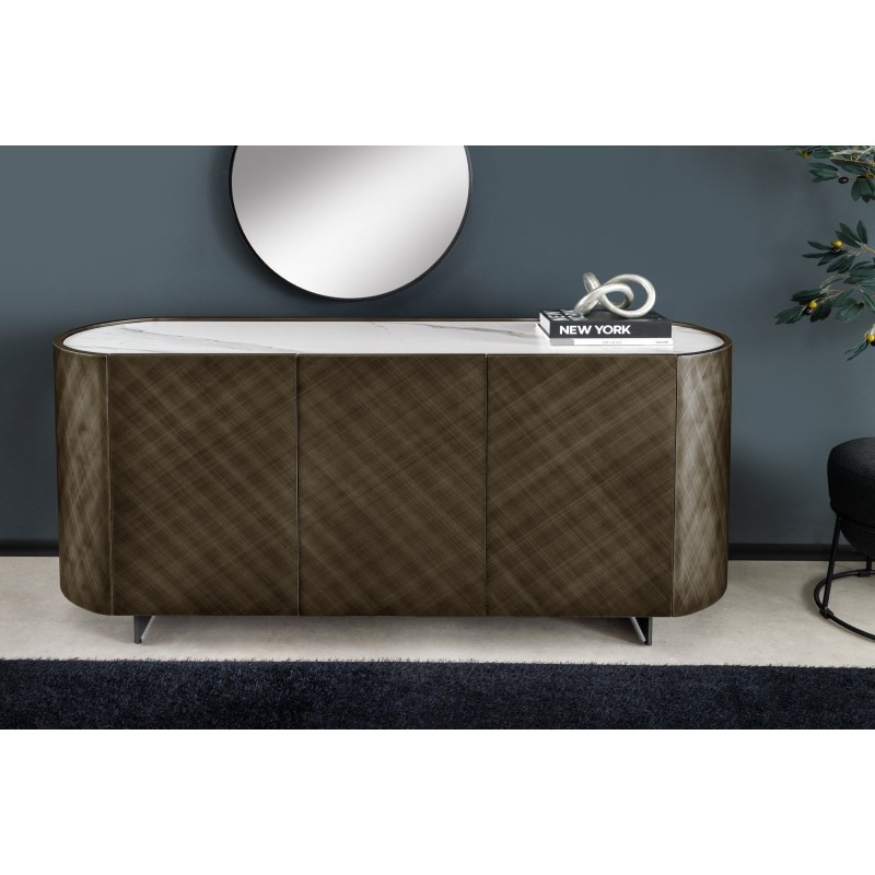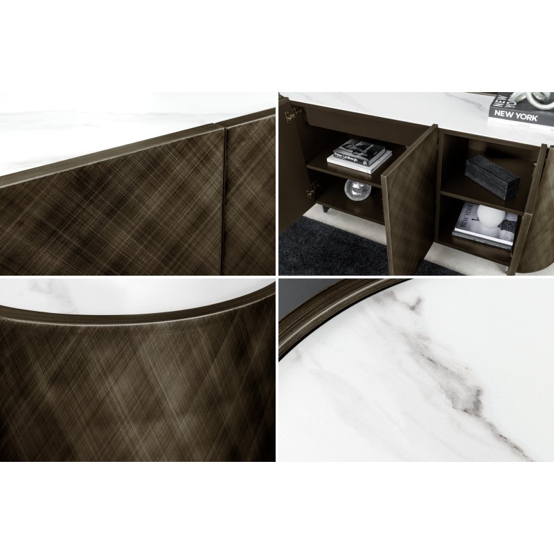 Ce buffet MILANO 150 cm incarne le design contemporain dans toute sa splendeur. Sa forme galbée et son placage sophistiqué à effet quadrillé 3D en finition bronze lui confèrent un style unique et raffiné. Le meuble est sublimé par un plateau en marbre blanc céramique, qui apporte une touche élégante et intemporelle.