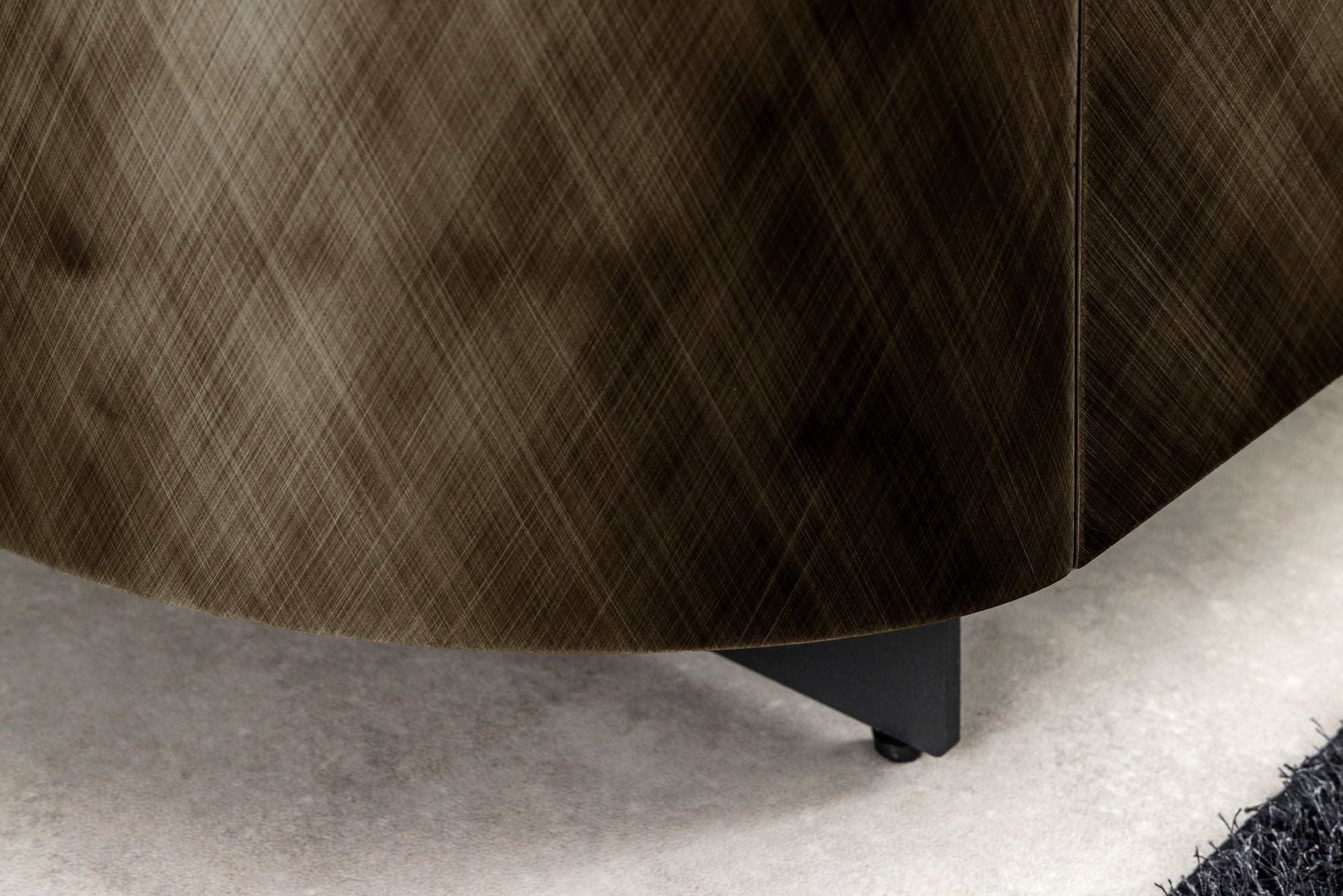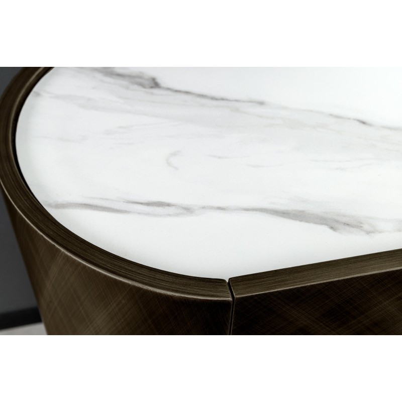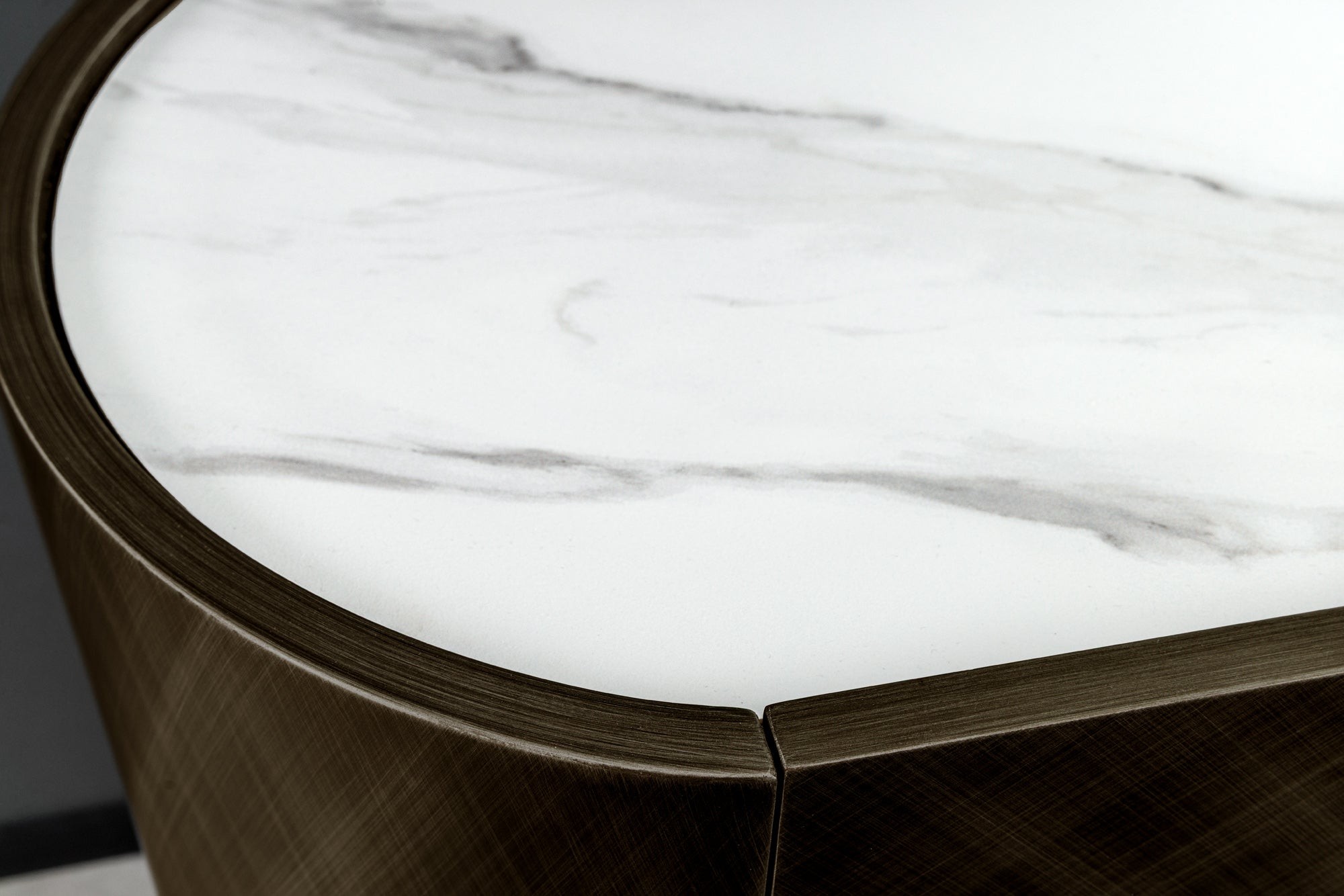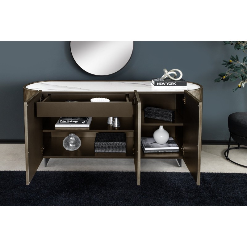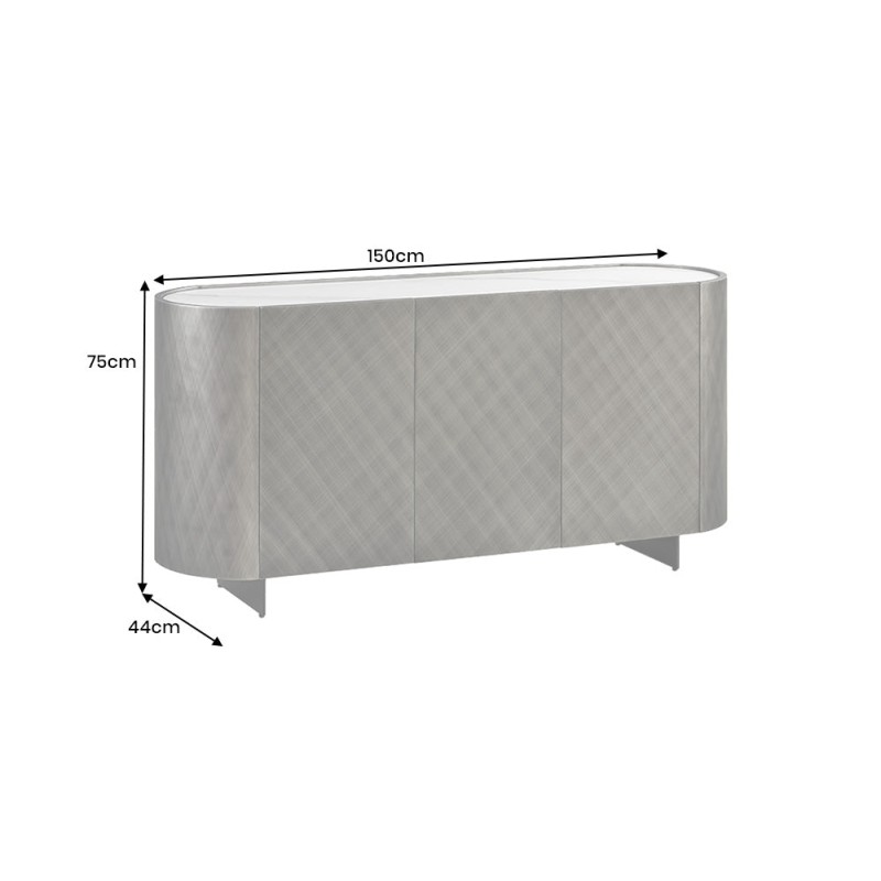 Ce buffet MILANO 150 cm incarne le design contemporain dans toute sa splendeur. Sa forme galbée et son placage sophistiqué à effet quadrillé 3D en finition bronze lui confèrent un style unique et raffiné. Le meuble est sublimé par un plateau en marbre blanc céramique, qui apporte une touche élégante et intemporelle.