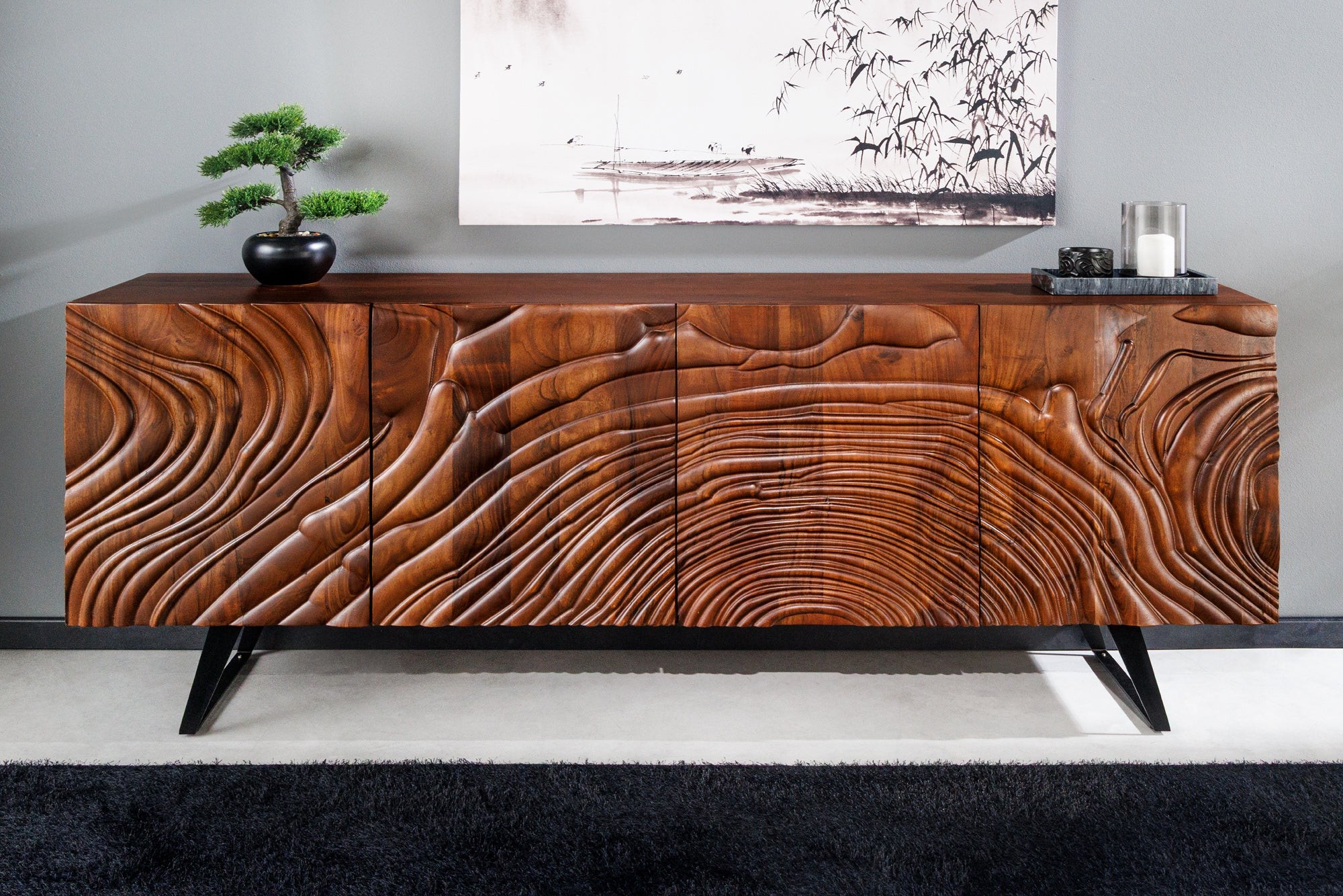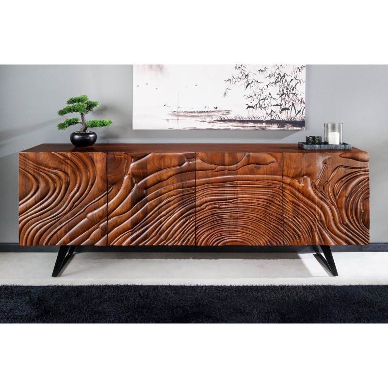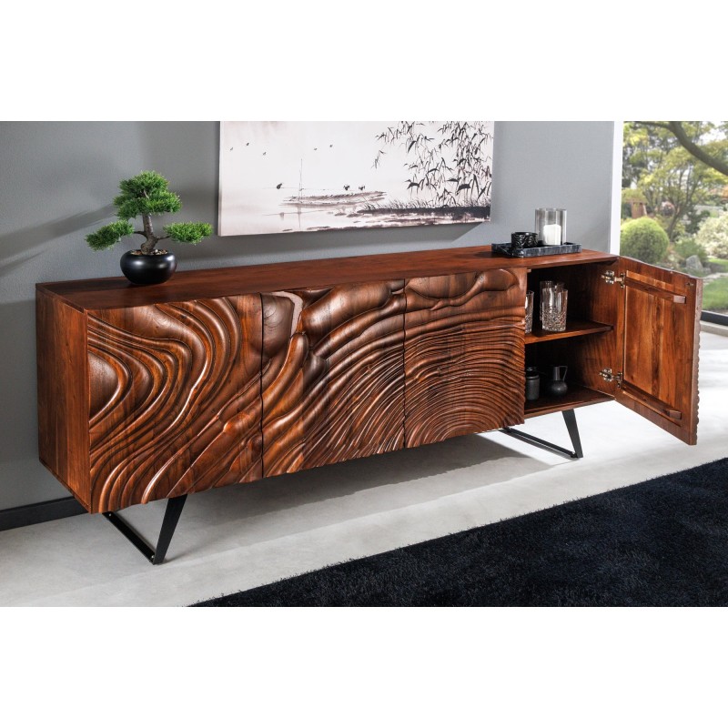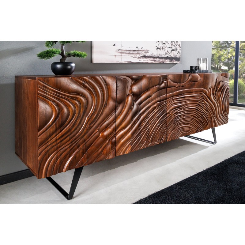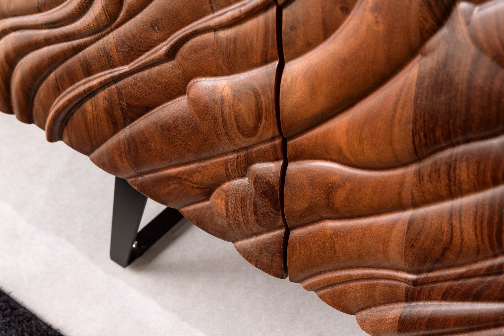 Le buffet GAÏA 175 cm séduit par son design spectaculaire et organique. Réalisé en bois massif d’acacia, il dévoile des façades sculptées en 3D qui évoquent des ondulations naturelles ou des striures minérales. Sa finition noyer brun foncé apporte chaleur et élégance à votre intérieur, tout en affirmant un style moderne et haut de gamme.