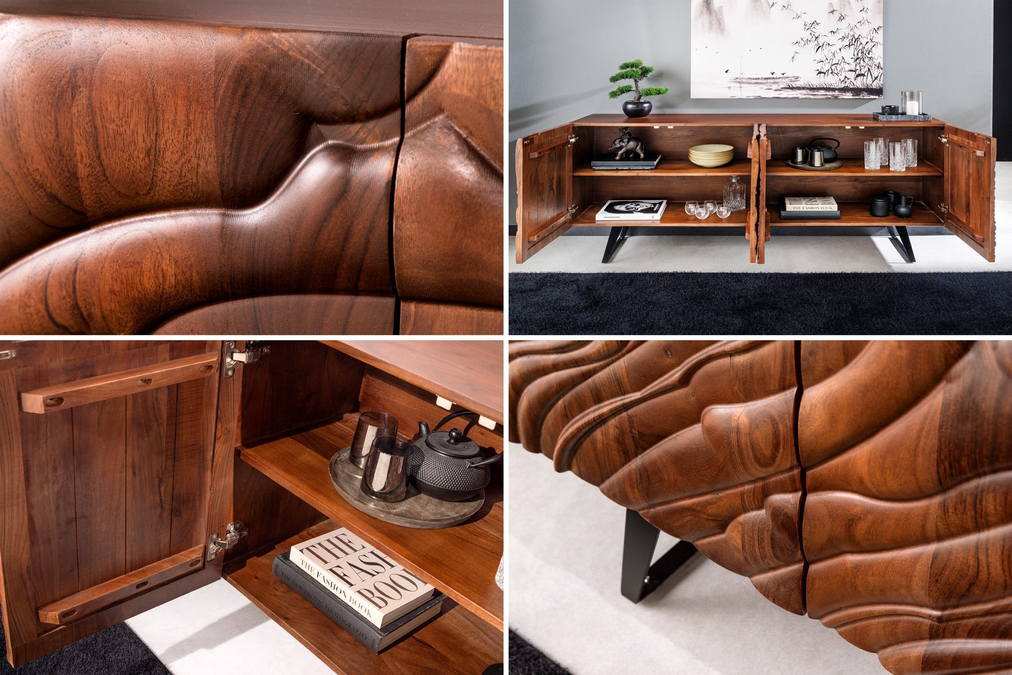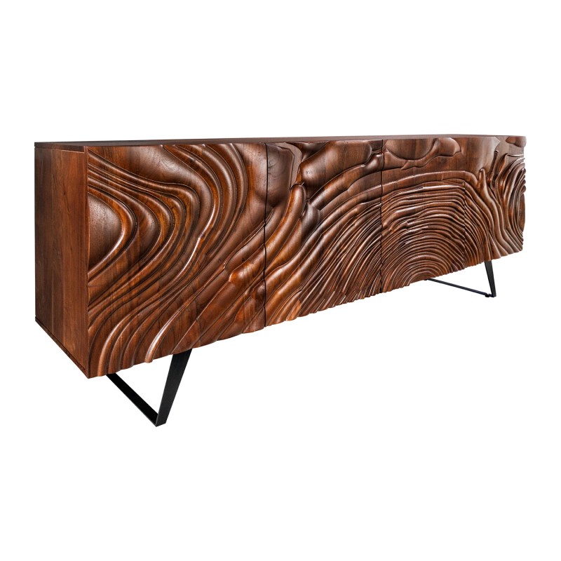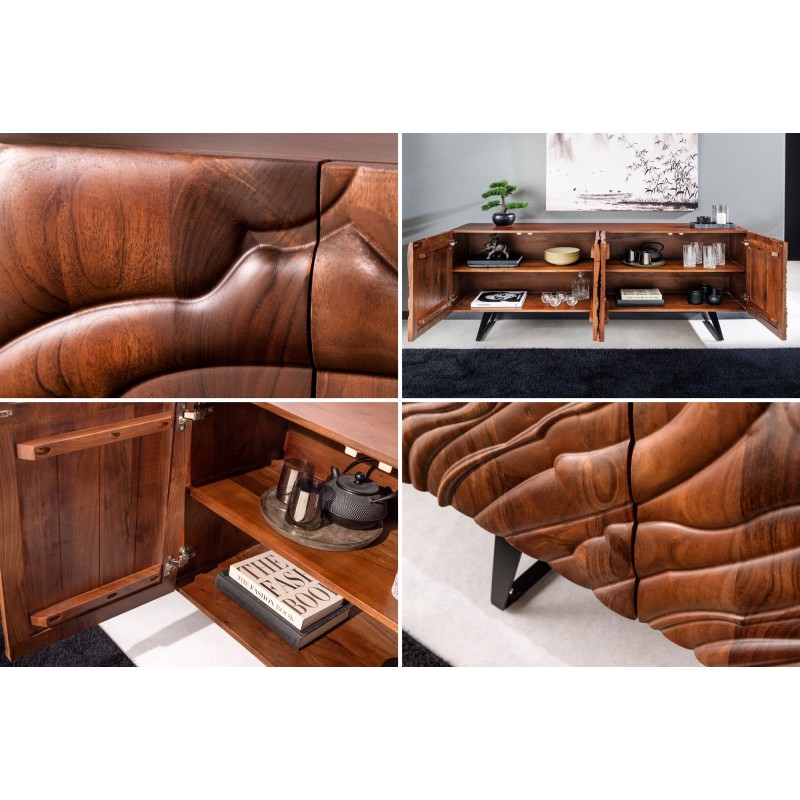 Le buffet GAÏA 175 cm séduit par son design spectaculaire et organique. Réalisé en bois massif d’acacia, il dévoile des façades sculptées en 3D qui évoquent des ondulations naturelles ou des striures minérales. Sa finition noyer brun foncé apporte chaleur et élégance à votre intérieur, tout en affirmant un style moderne et haut de gamme.