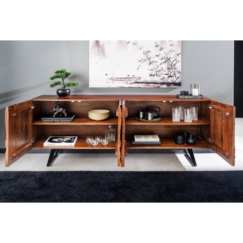 Doté de 4 portes battantes et de 2 étagères intérieures, ce buffet offre un vaste espace de rangement tout en incarnant une véritable pièce décorative. Sa structure robuste en bois massif associée à des détails en métal souligne son esprit à la fois contemporain et authentique.