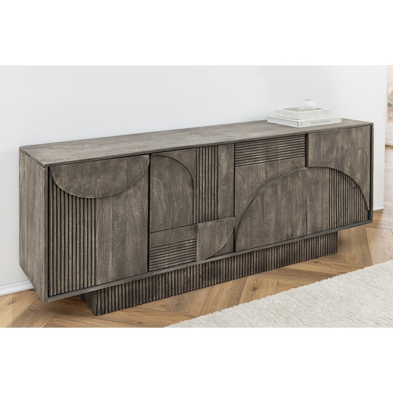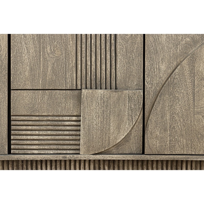 Le buffet SÖREN 170 cm impose son caractère avec sa finition bois de manguier fumé aspect gris. Inspiré de l’esthétique Art Déco, il se distingue par ses façades sculptées en relief géométrique et sa teinte grisée, qui apporte une touche de modernité subtile à son allure chaleureuse. Un meuble qui conjugue authenticité et élégance contemporaine.