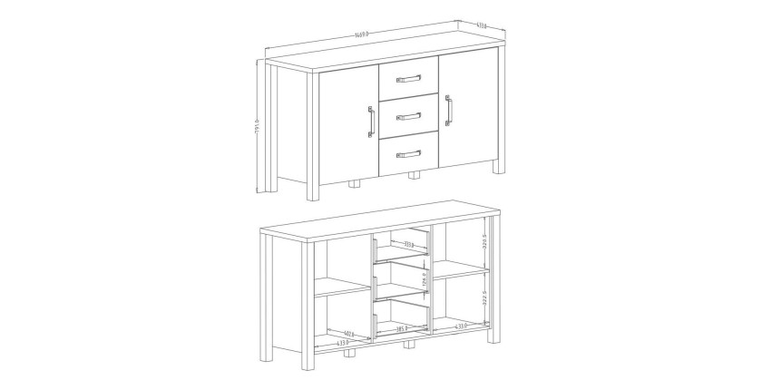 - CARACTÉRISTIQUES : Buffet avec 2 portes et 3 tiroirs.