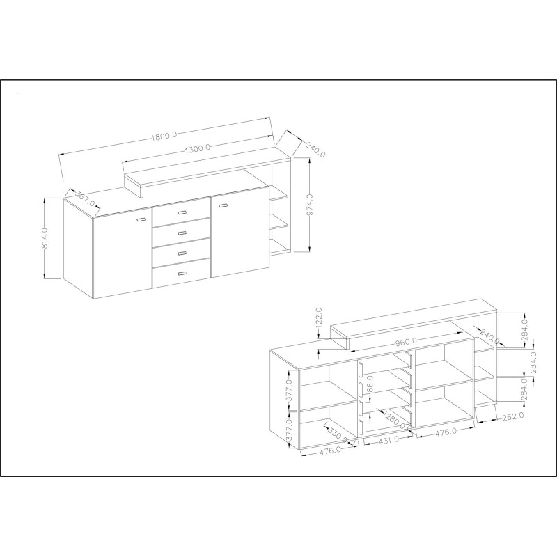 - CARACTÉRISTIQUES : Buffet avec 4 tiroirs, deux portes et une étagère intégrée.