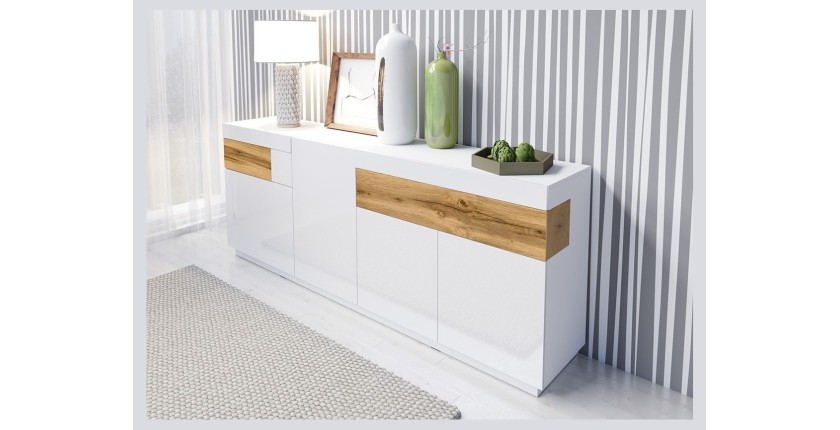 Ajoutez une touche contemporaine à votre séjour avec le buffet KILES. Ce meuble au design moderne associe le blanc lumineux à la chaleur du chêne clair pour créer une atmosphère à la fois épurée et accueillante.