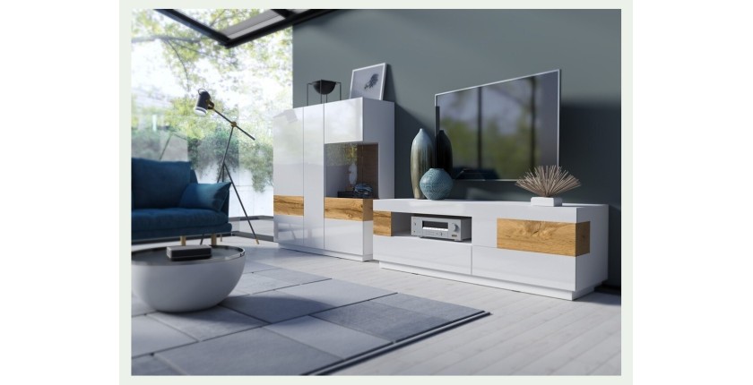 - COLORIS : Corps du meuble blanc et chêne. façades portes blanches brillantes et chêne