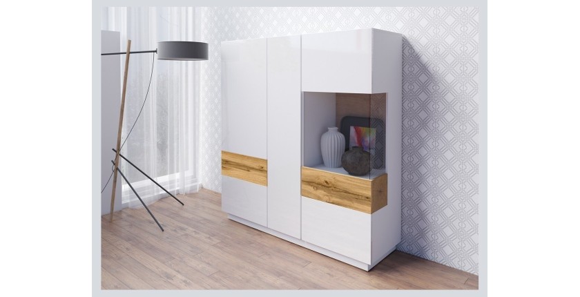 Offrez à votre salon un style unique au top des dernières tendances déco grâce à ce buffet haut de la gamme KILES ! Ce buffet est composé de nombreux rangements grâce à ses trois portes. Mettez en valeur vos objets décoratifs grâce à sa porte en partie vitrée et son éclairage LED intégré.