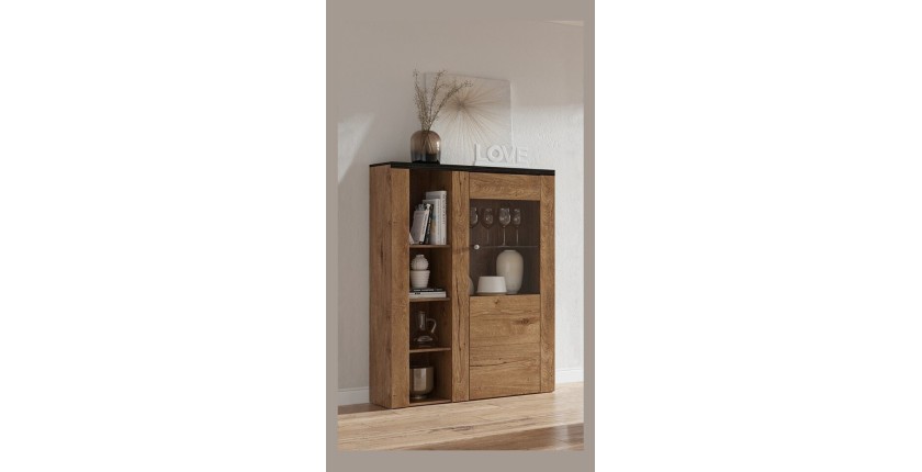 Offrez à votre salon un style unique avec ce buffet haut au design tendance de la collection SANTIAGO. Avec sa grande porte battante partiellement vitrée et ses quatre niches, il offre un bel espace de rangement pour ordonner vos affaires.