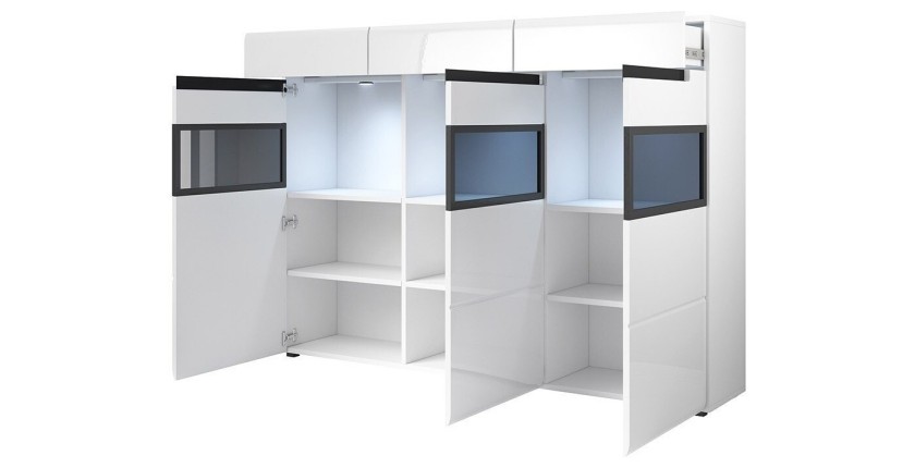 - CARACTÉRISTIQUES : Buffet partiellement vitrées, 9 espaces de rangement derrière les 3 portes. 3 tiroirs sur le haut du buffet.