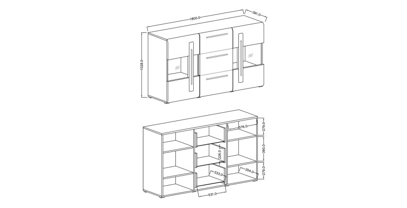 - CARACTÉRISTIQUES : Buffet avec 2 portes partiellement vitrées avec trois tiroirs.