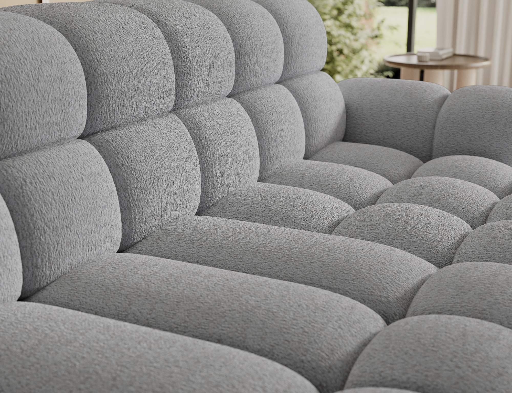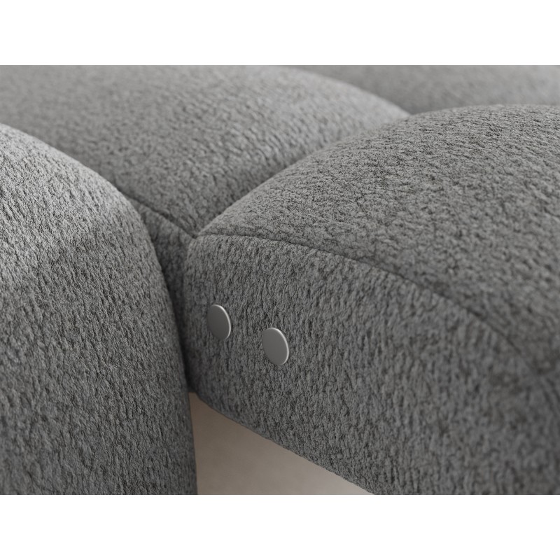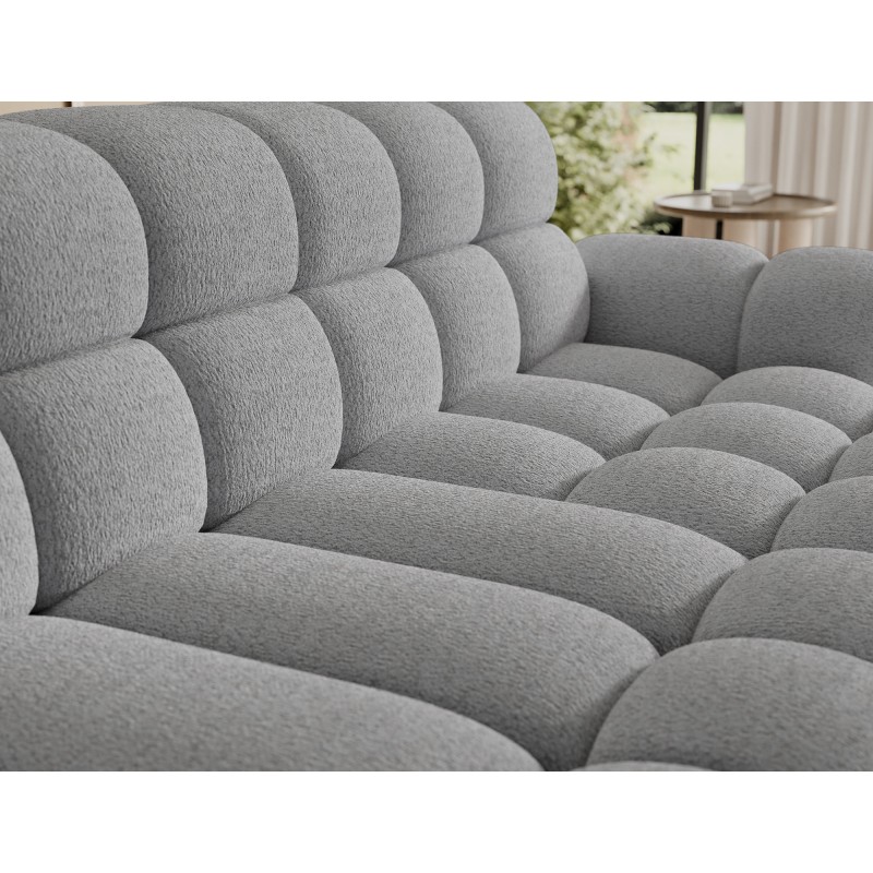 Le tissu bouclette, très apprécié dans les intérieurs contemporains, offre un relief doux et un aspect cosy qui renforce le caractère du canapé. Son coloris gris intemporel s’harmonise facilement avec différents styles de décoration.