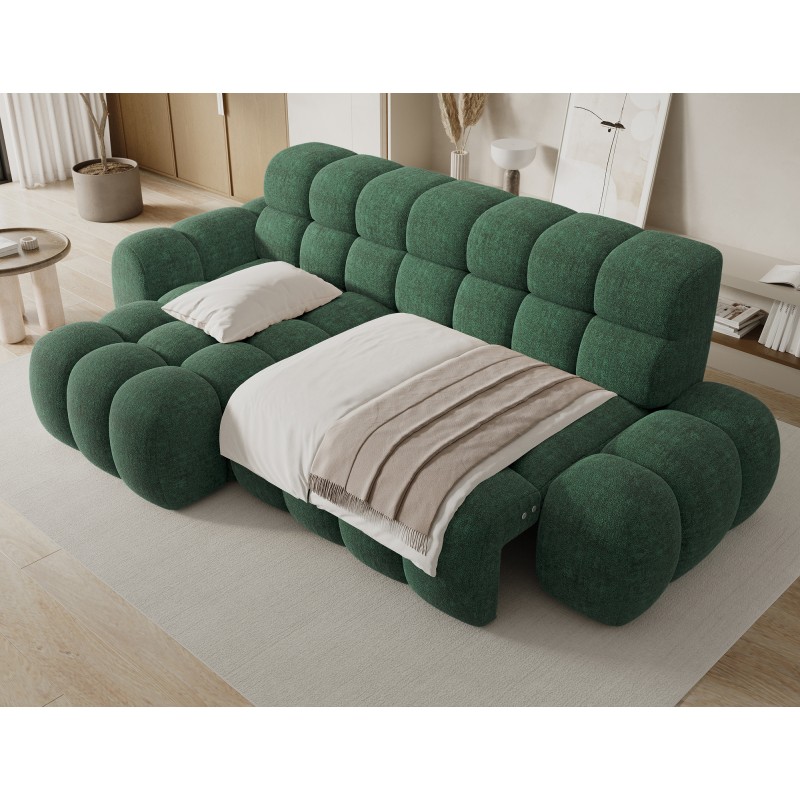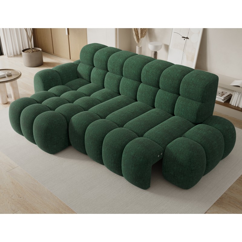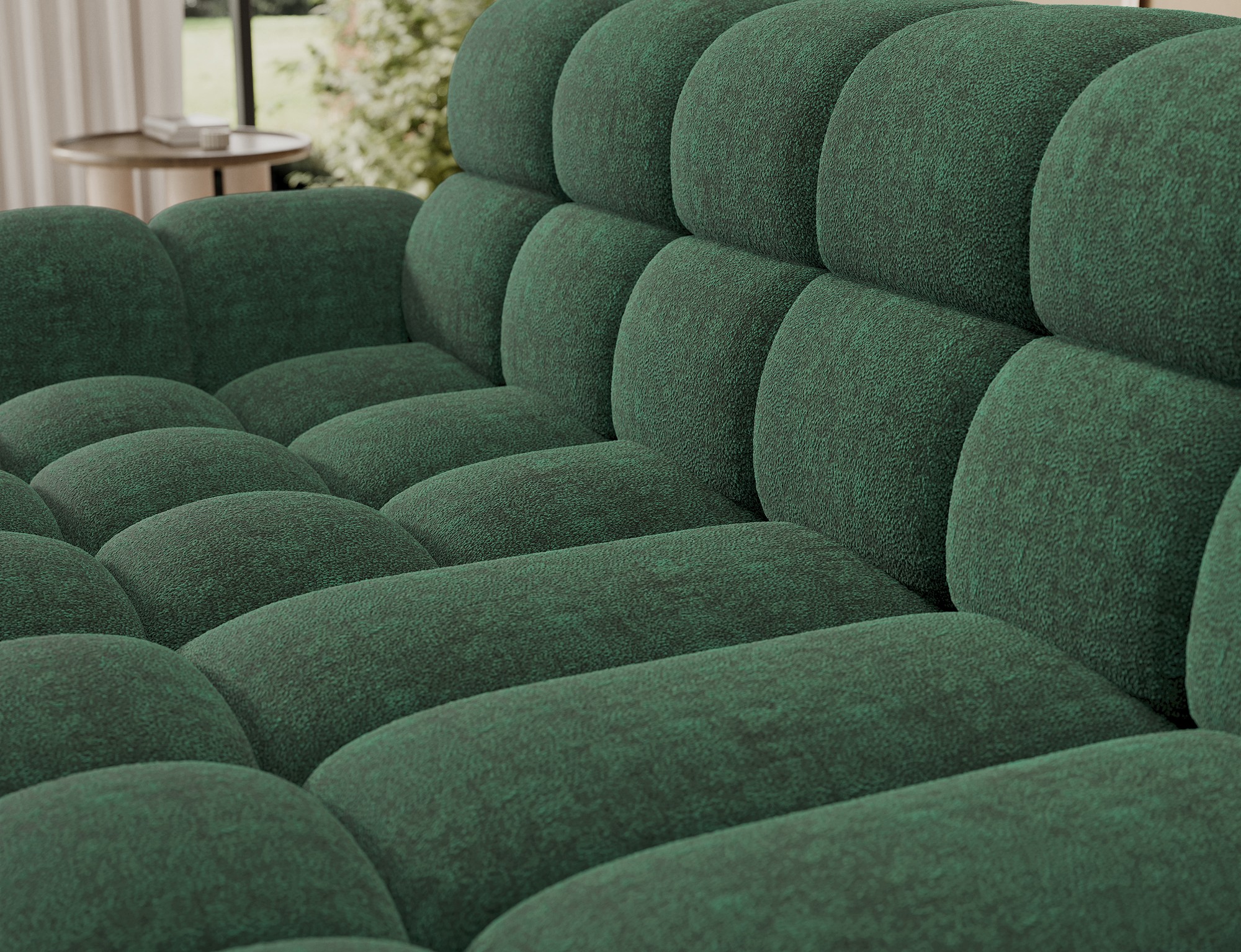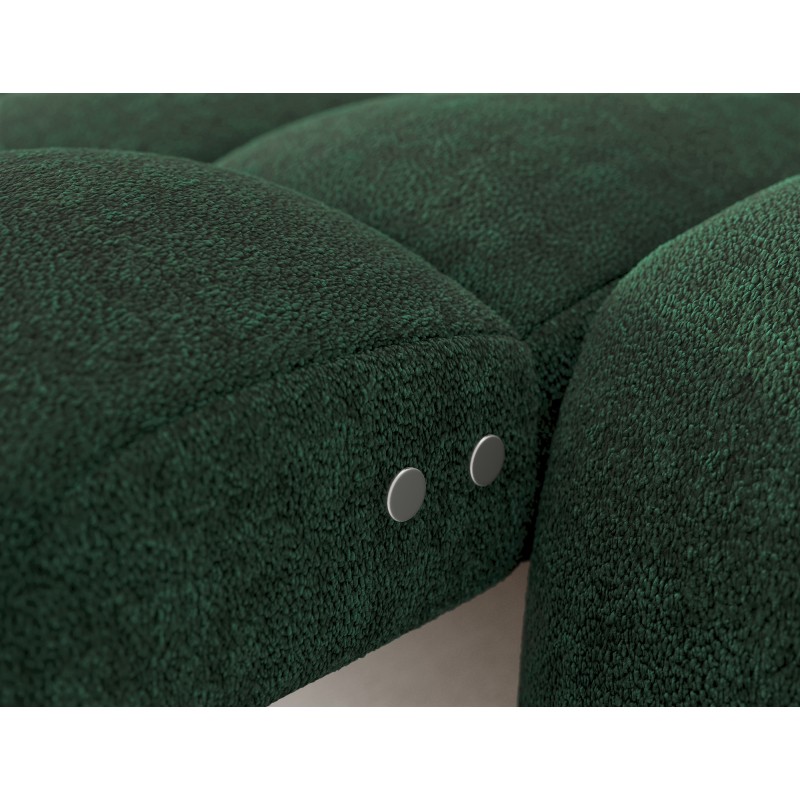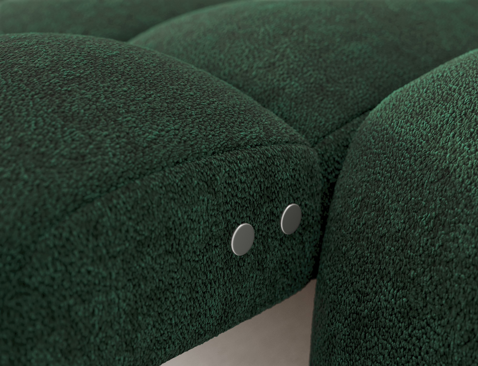 Le tissu bouclette, très apprécié dans les intérieurs contemporains, offre un relief élégant et un aspect cosy qui renforce le caractère du canapé. Son coloris vert émeraude apporte une note sophistiquée et tendance qui valorise votre décoration intérieure.