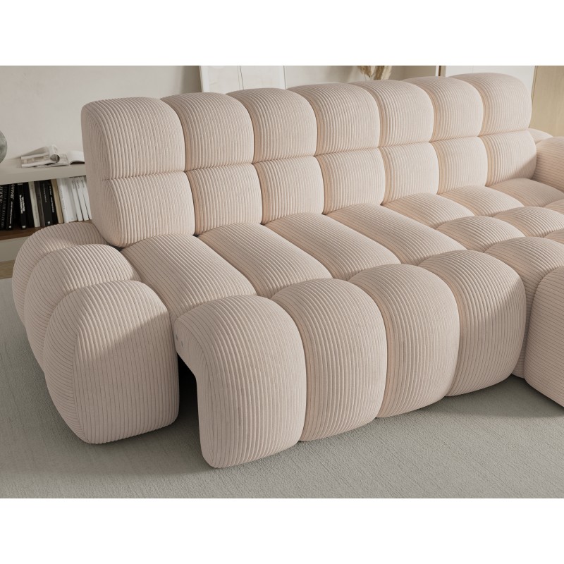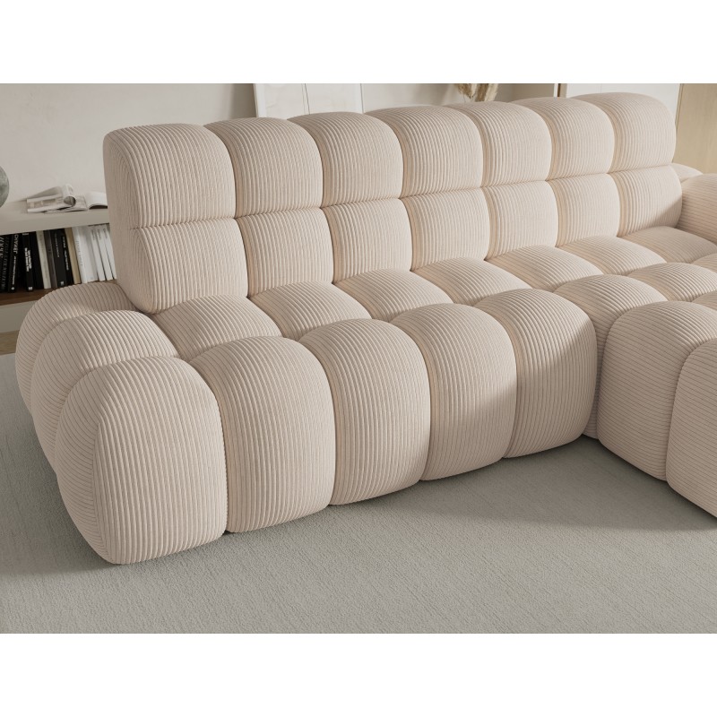 Le canapé d’angle BULLA combine design moderne, confort généreux et fonctionnalités pratiques pour créer un espace de détente idéal dans votre salon. Son revêtement en velours côtelé beige apporte une touche élégante et chaleureuse tout en offrant un toucher doux et confortable.