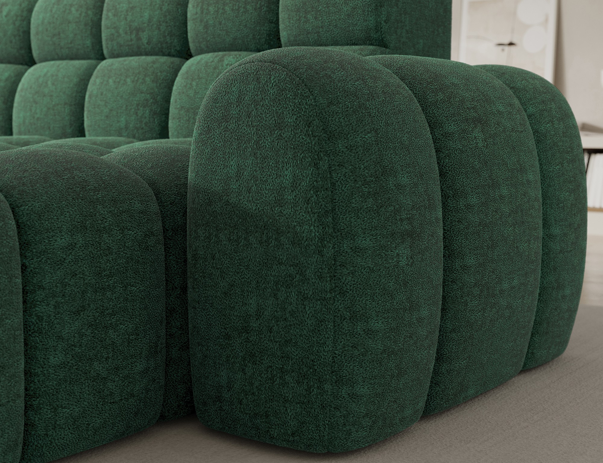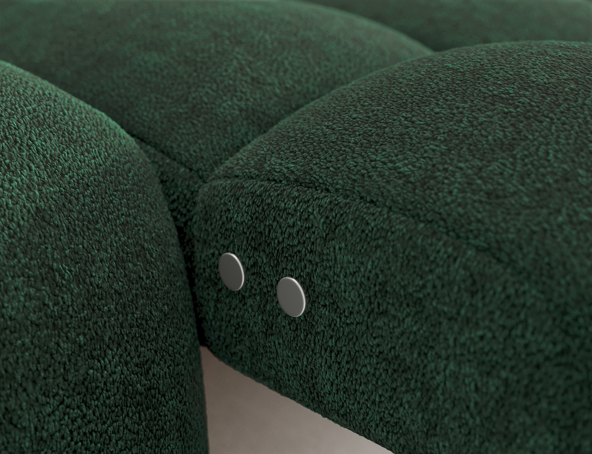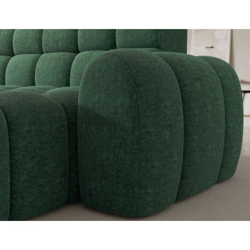 Le tissu bouclette, très apprécié dans les intérieurs contemporains, offre un relief élégant et un aspect cosy qui renforce le caractère du canapé. Son coloris vert apporte une note originale et tendance tout en restant facile à associer dans différents styles de décoration.