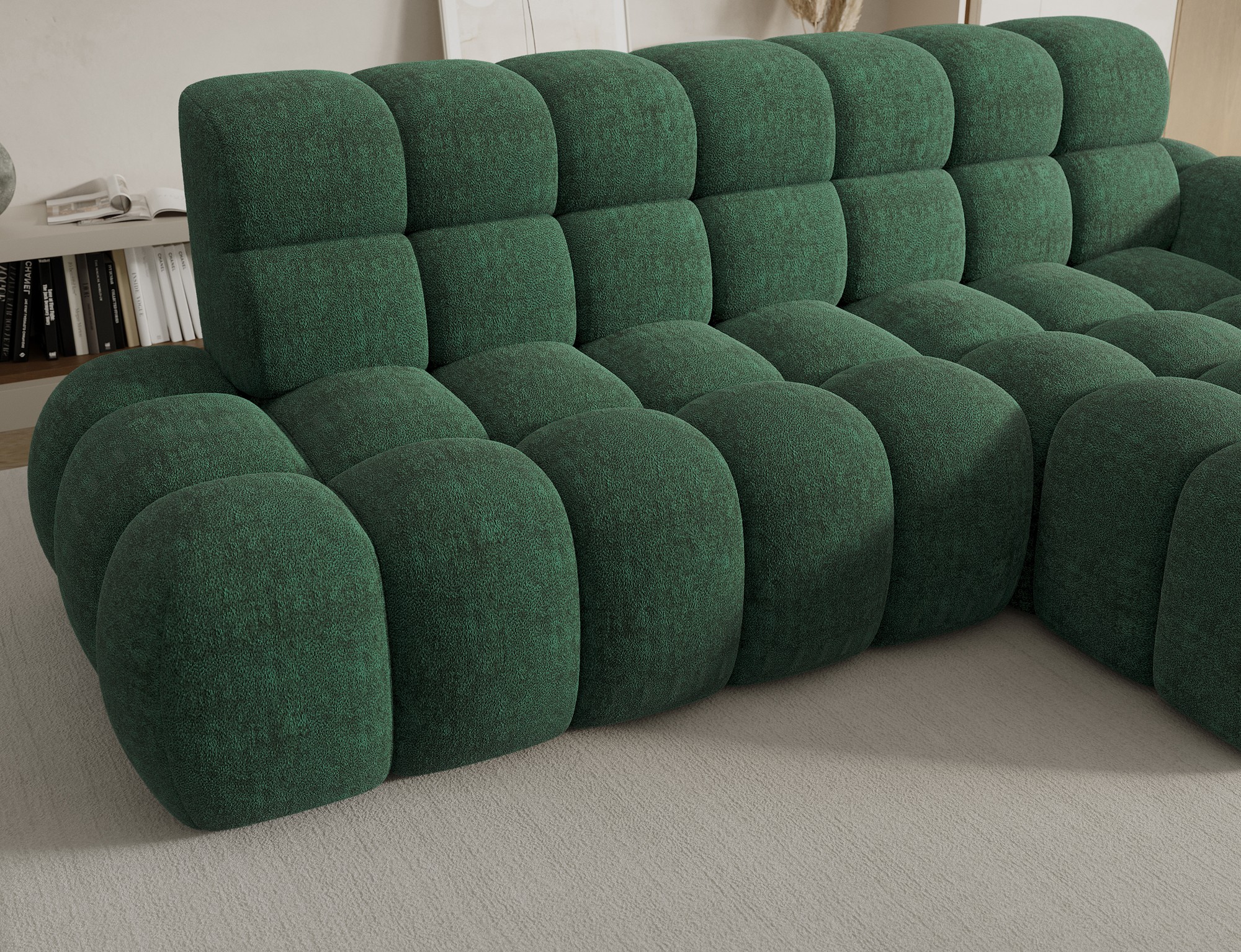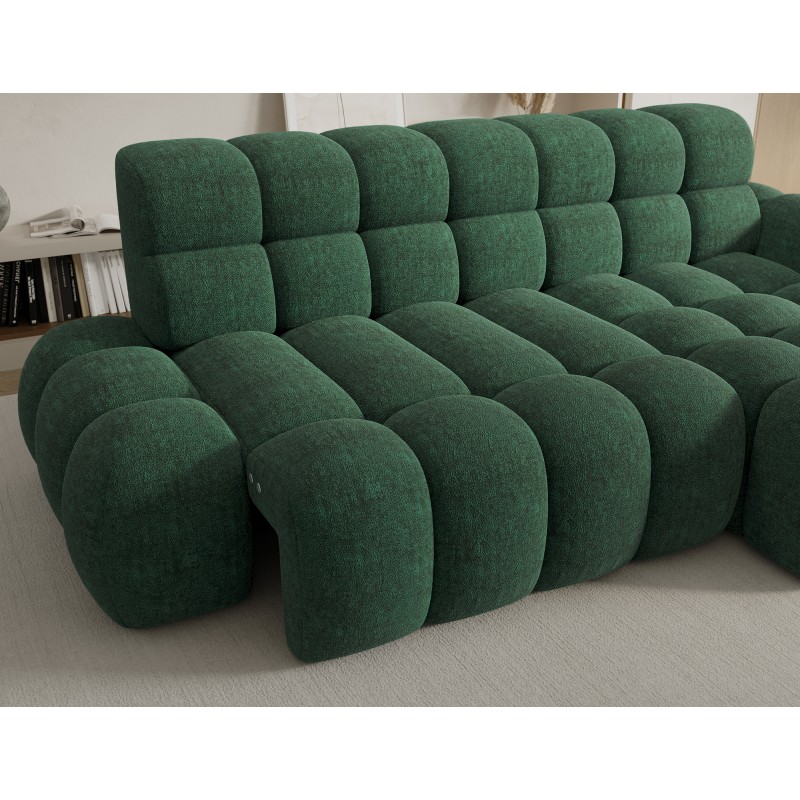 Le canapé d’angle BULLA associe design moderne, confort généreux et fonctionnalités pratiques pour sublimer votre salon. Son revêtement en tissu bouclette vert apporte une touche contemporaine et chaleureuse tout en offrant un toucher doux particulièrement agréable.