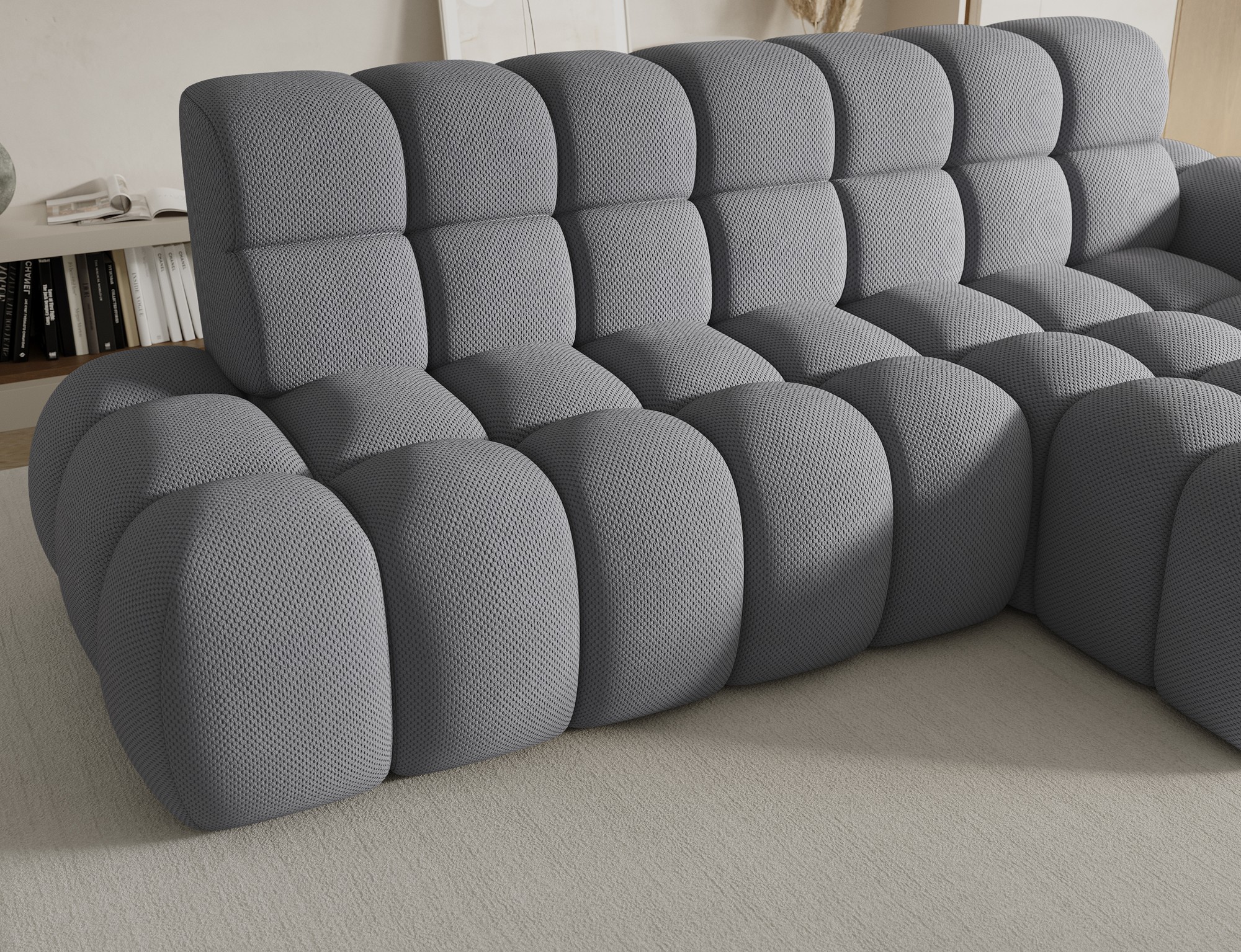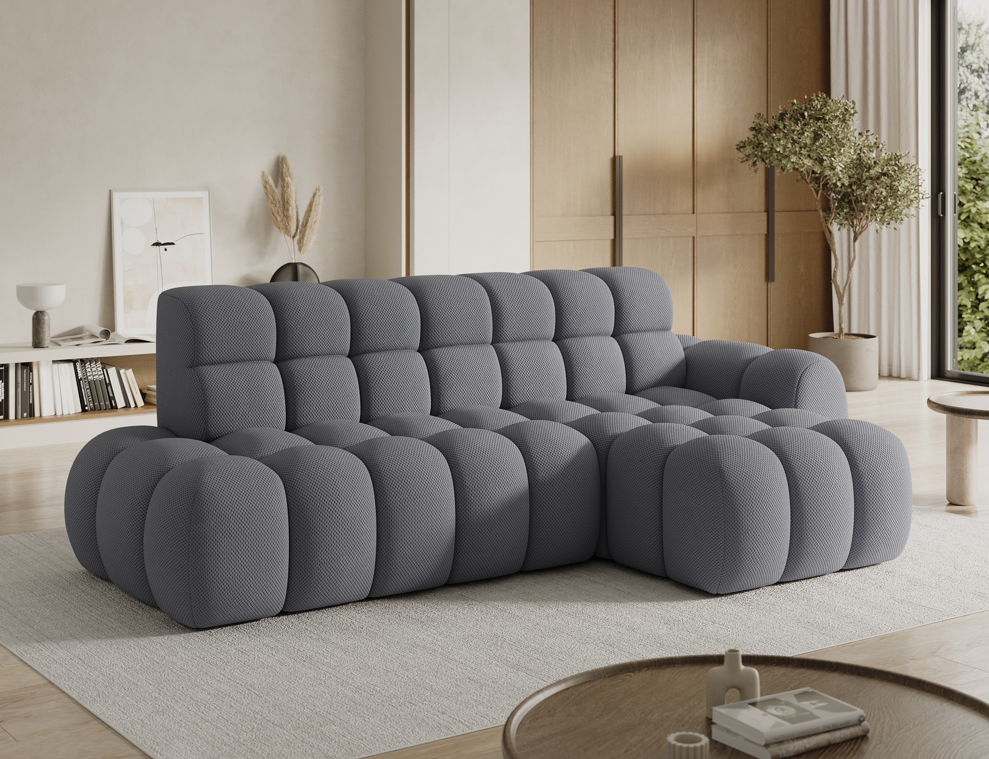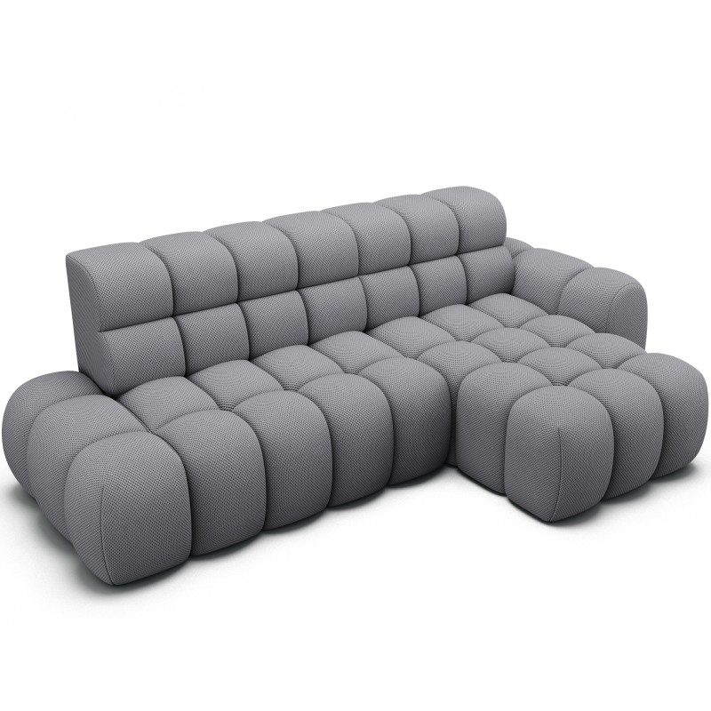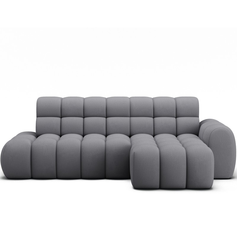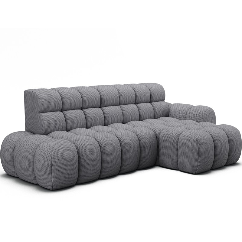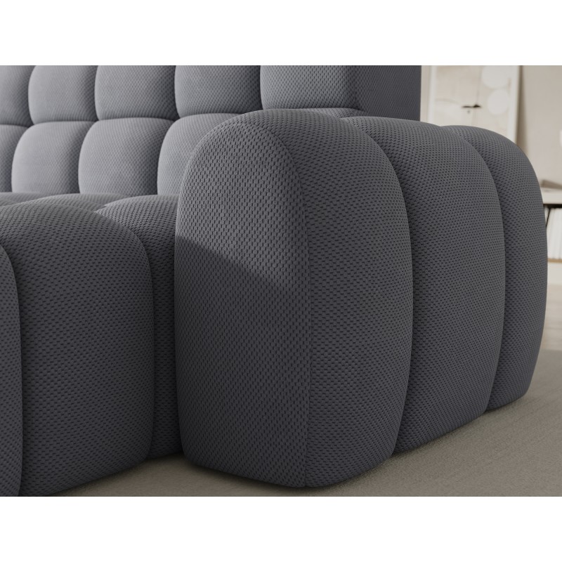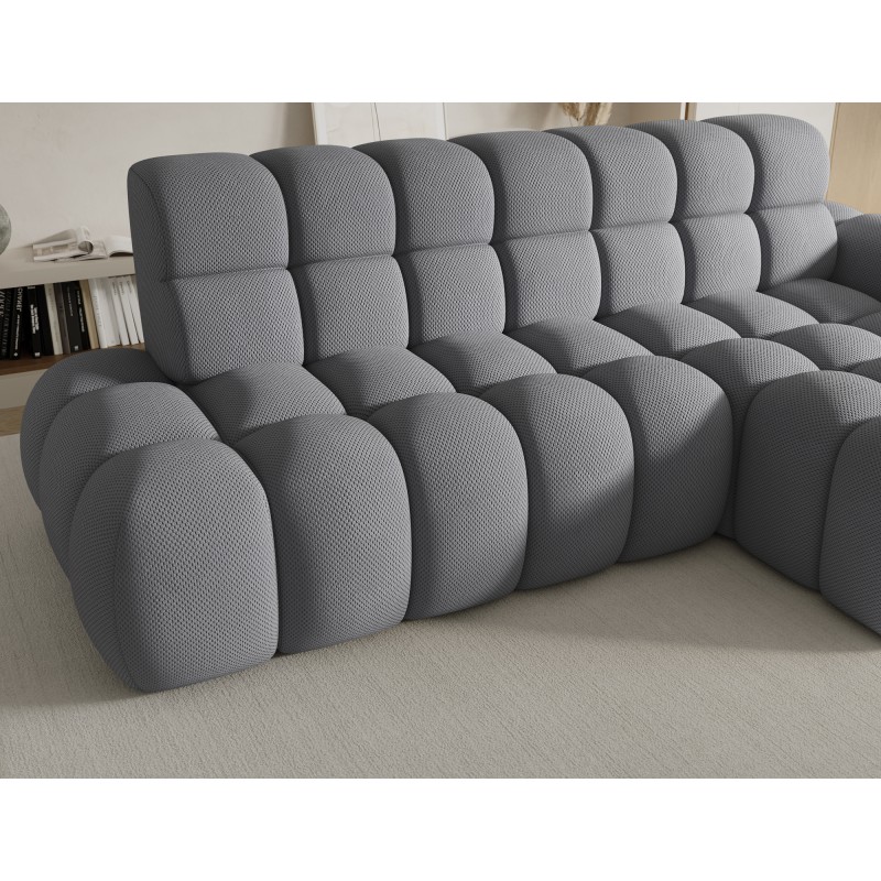 Le canapé d’angle BULLA combine design contemporain, confort généreux et fonctionnalités pratiques pour transformer votre salon en véritable espace de détente. Son revêtement en tissu nid d’abeille gris apporte une texture élégante et moderne qui s’intègre facilement dans les intérieurs actuels.