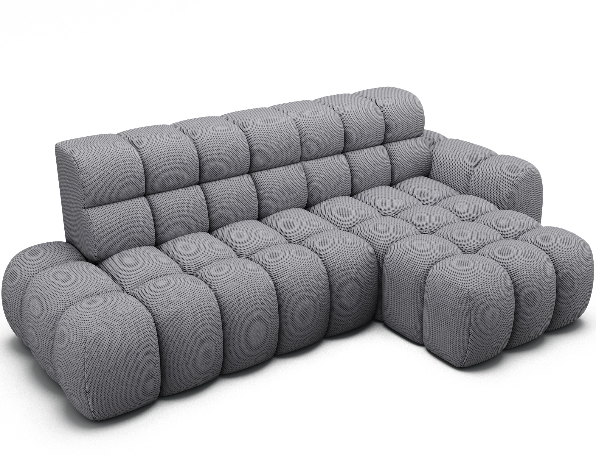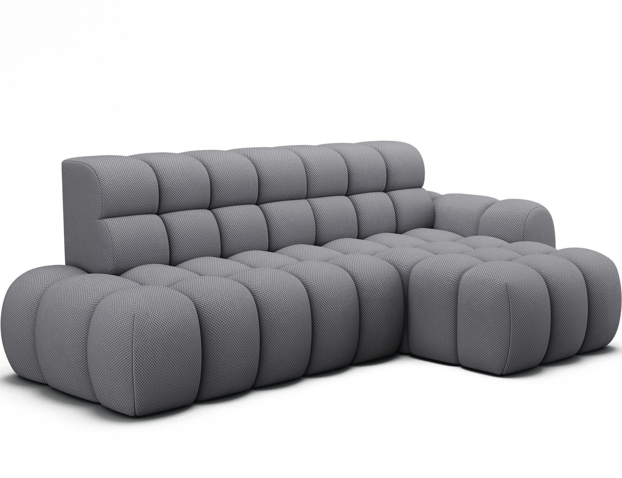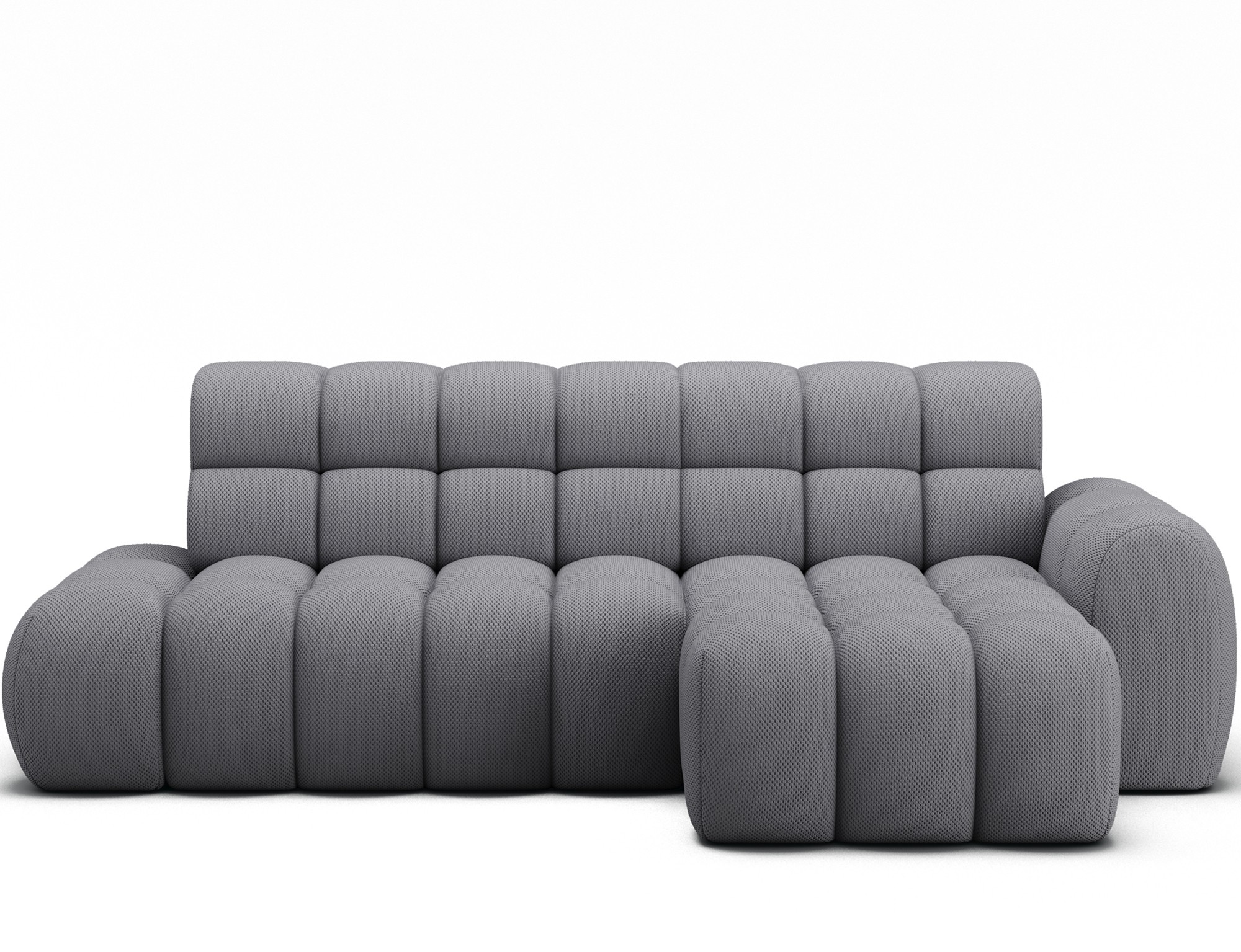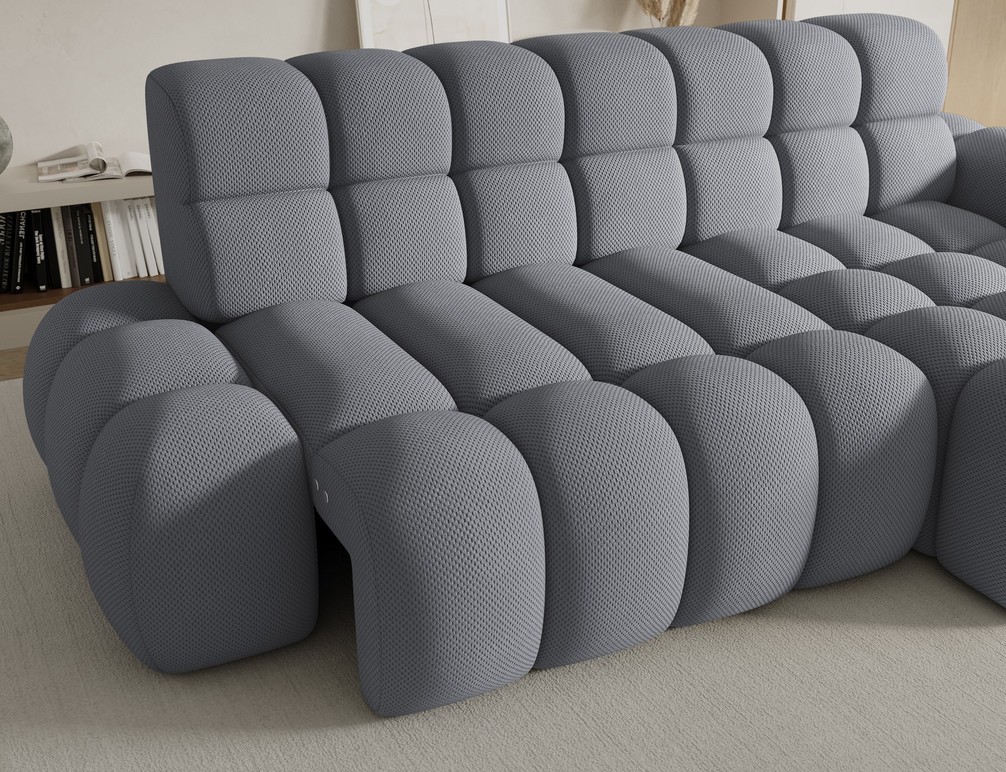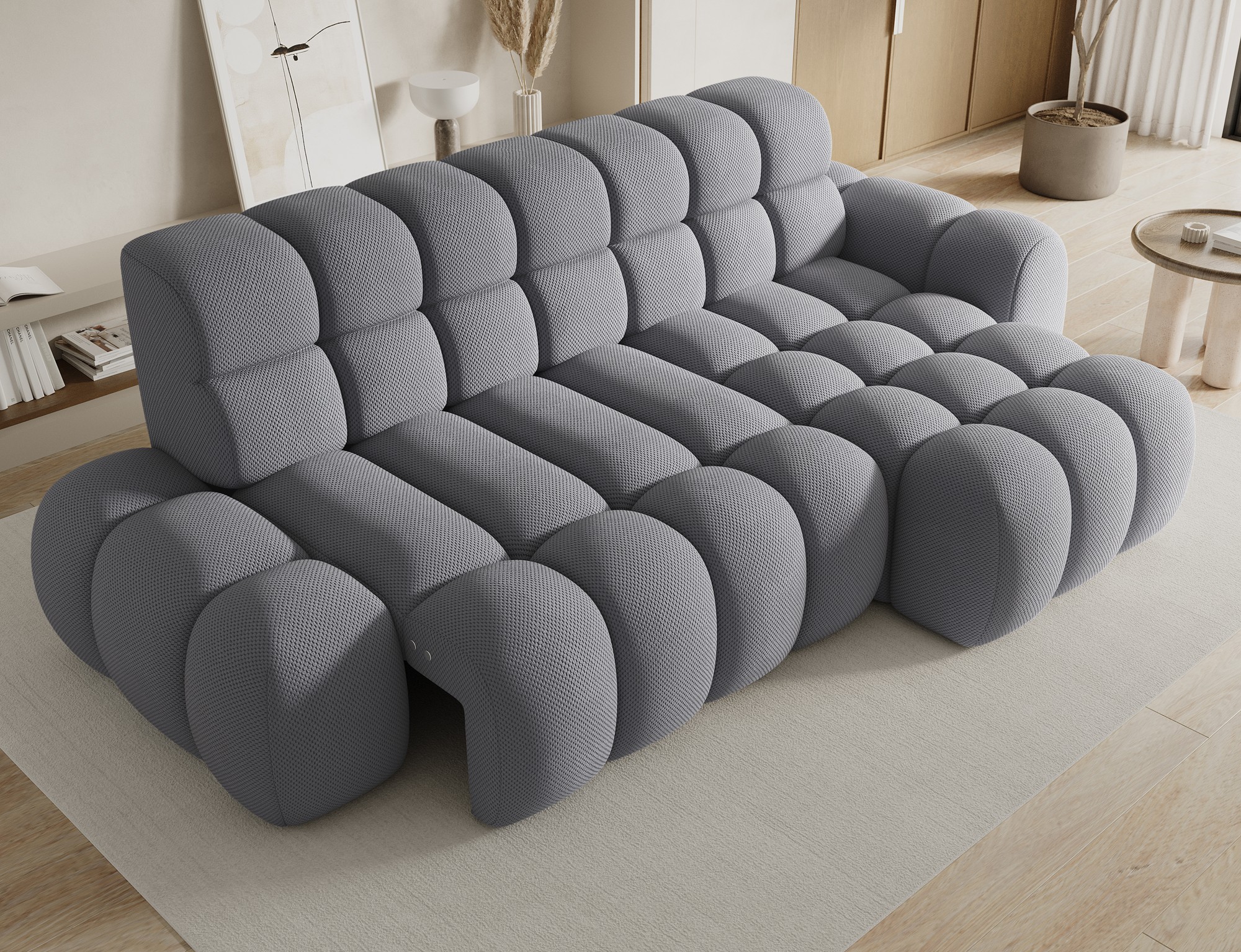 Le canapé d’angle BULLA combine design contemporain, confort généreux et fonctionnalités pratiques pour transformer votre salon en véritable espace de détente. Son revêtement en tissu nid d’abeille gris apporte une texture élégante et moderne qui s’intègre facilement dans les intérieurs actuels.